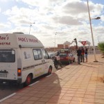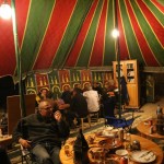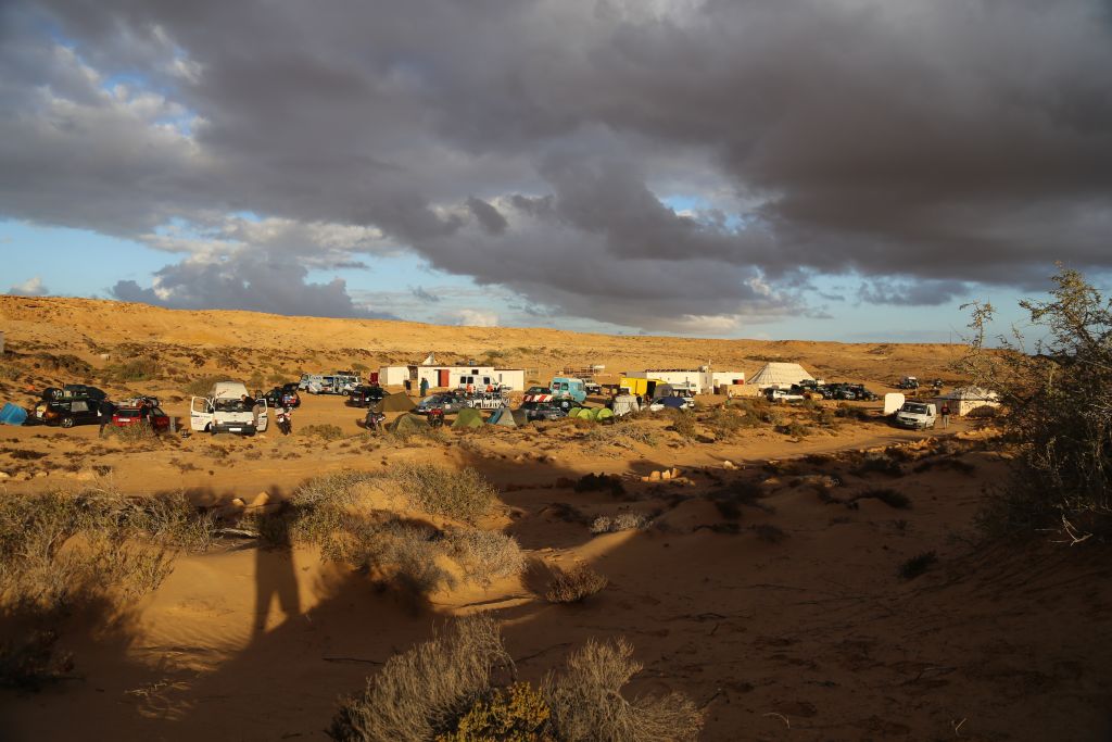 Die Straße führt durch steinige Landschaften, Einöden und Wüste. kilometerweit nichts, nur Steine, Sand, Wind und Sonne. Obwohl die Sonne scheint und wir in den Autos schwitzen, musste Adi sich lange Unterhosen und zwei Jacken anziehen, Weichei… Nein, nein, der Wind weht ziemlich stark mit viel Sand und ist kalt. Ab und zu sieht man Menschen, die irgendwo am Straßenrand stehen und warten. Ab und zu sieht man auch eine Schafherde oder freilaufende Kamele (nicht nur neben der Straße auch auf der Straße!). Ach ja, noch was komisches, es hat geregnet!!! Eine Wolke über uns und aus der regnet es. Nach 500 km erreichen wir kurz vor Laayoune das Beduinen-Camp (Campingplatz). Dieser Campingplatz liegt ca. 5 km von der eigentlichen Straße entfernt, mitten im Nichts. Dort hat sich ein Belgier mit seiner Frau niedergelassen und ein paar Beduinenzelte aufgestellt und ein kleines Restaurant eröffnet. Dort treffen wir auch die anderen Rallyeteilnehmer wieder. Zum Abendbrot gibts das „Menu of the desert“. Courgette-Suppe (keine Ahnung was das war, aber es hat geschmeckt), Kamelfleisch-Spieße mit Gemüse und Reis und zum Schluss einen leckeren Obstsalat.