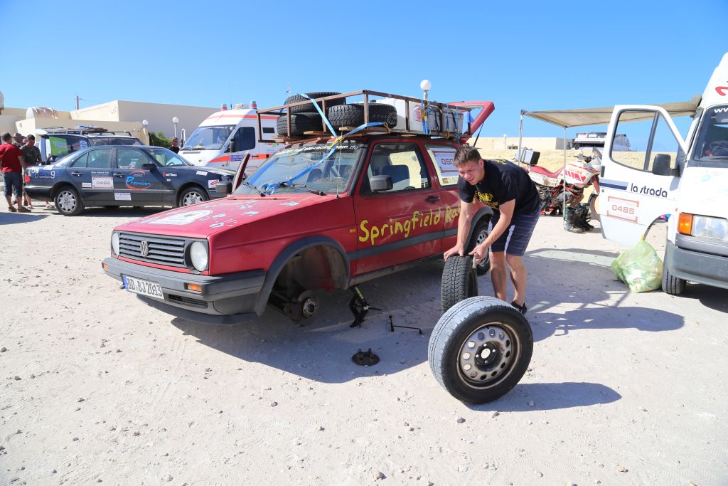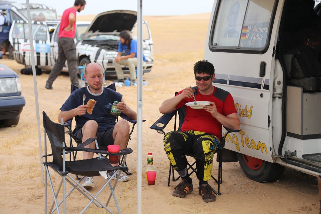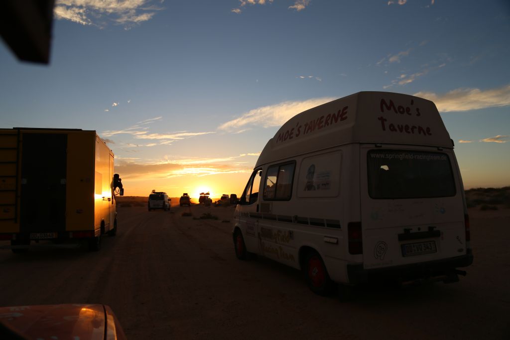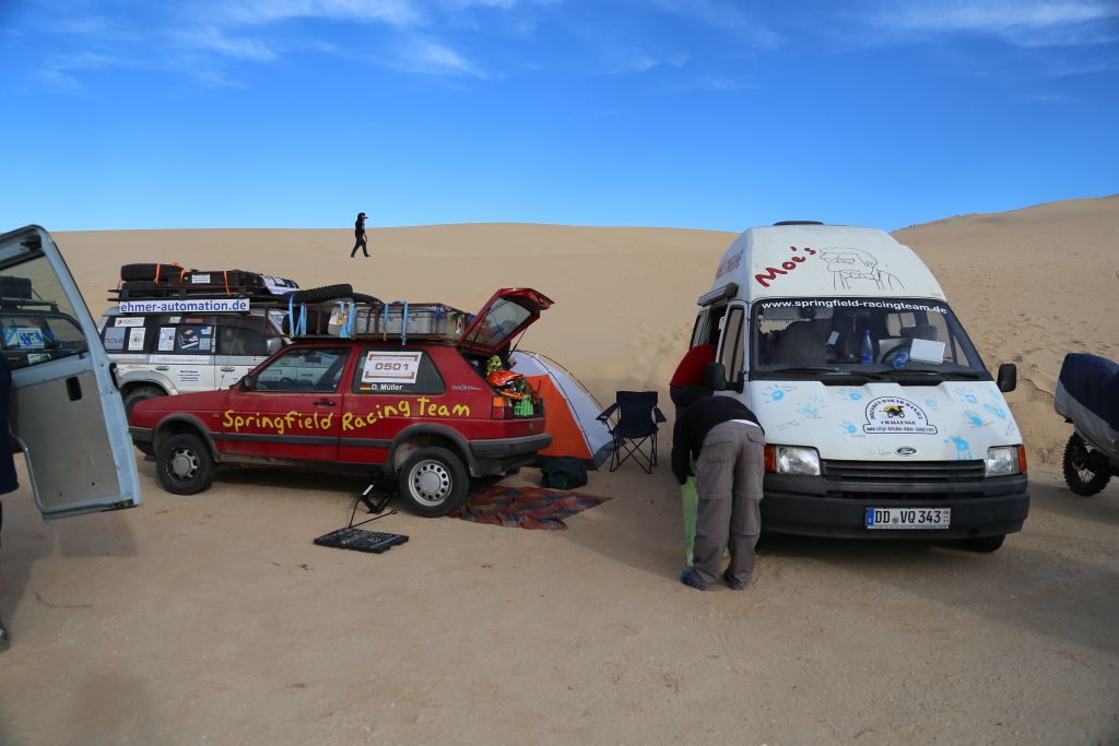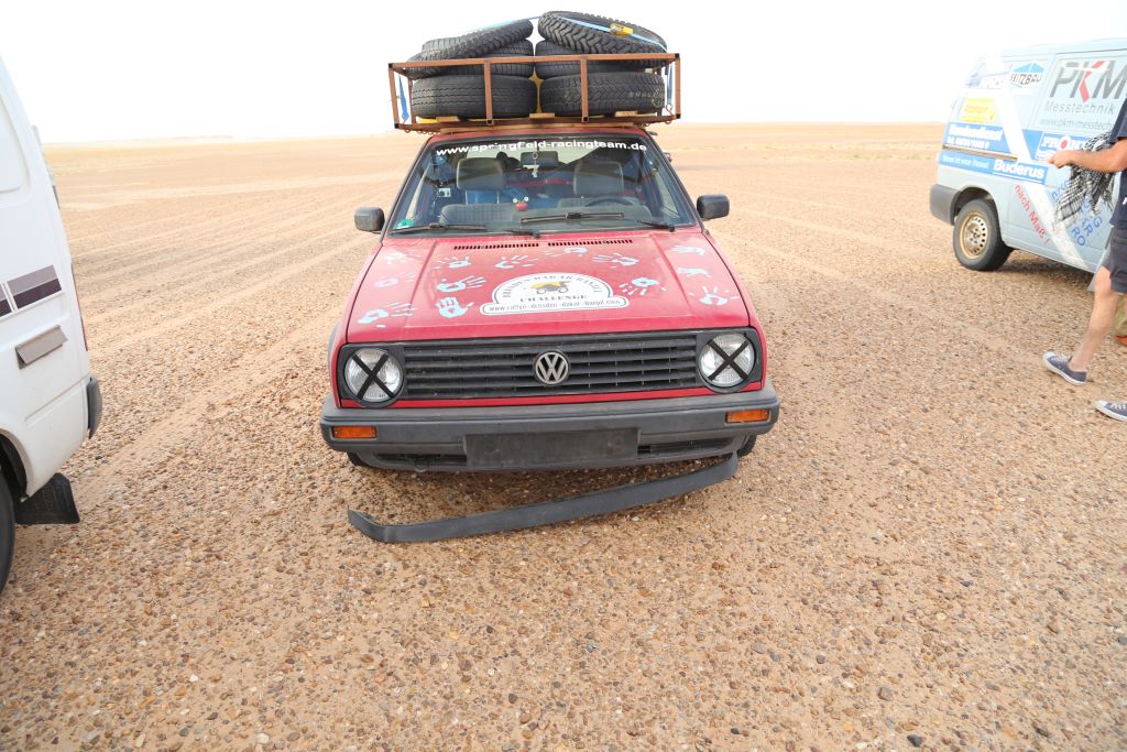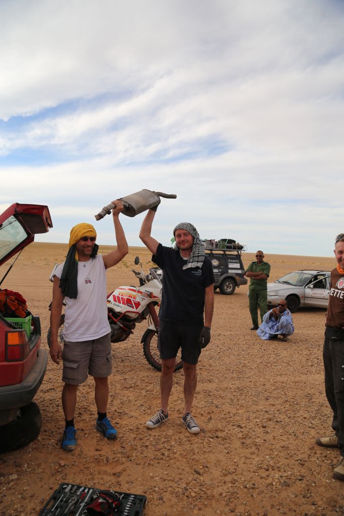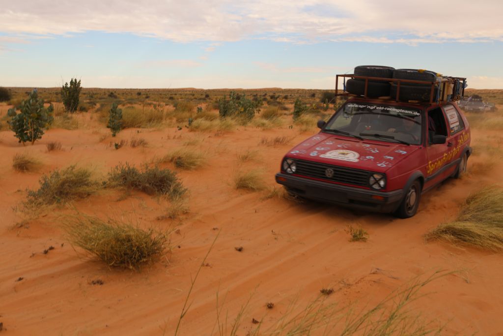 Heute war es endlich soweit!!! Zwar mussten wir uns nochmal 200 km über mauretanische Landstraßen quälen, aber dann war es soweit. Wir bogen von der Straße ab hinein ins Gelände. Nach einem Wüsten-Briefing und einer Mittagspause ging es querfeldein über Sand, kleine Grasbüchel und Kies. Adi im Crosser-Outfit gewöhnt sich langsam an den Sand und kommt super durch. Der Bus fährt sich im Gelände gemütlich und macht sich gut. Auch der Golf kommt prinzipiell gut durch, allerdings ist es hier schon mehr Arbeit… Auch weil nach den ersten paar Kilometern sich der Mittelschalldämpfer vom vorderen Auspuffrohr gelöst hatte. Nun schleifte der Endschalldämpfer auf dem Boden, er musste ab! Mitten in der Wüste wurde mit Hammer und Flex selbiger in nur 30 Minuten entfernt und es konnte weiter gehen. Der Sound ist jetzt noch besser ;-). Nach weiteren 5 km verlor der Golf sein Frontlippe, aber jetzt ist erstmal alles in Ordnung. Achso, dann gab es selbstverständlich auch einige Einsandungen, allerdings nicht von uns. Aber das sind alles Kleinigkeiten, ein anderes Team, ein Audi, hatte seinen hinteren Stoßdämpfer eingebüst. Nach einem kleinen Sprung über eine Sandwelle war dieser in der Mitte zerbrochen. Glücklicherweise gab es einen Ersatzstoßdämpfer von einem weiteren Team. Dieser wird nun eingebaut, hoffentlich funktioniert es. Fortsetzung folgt, da wir mittlerweile das Nachtlager erreicht und eingerichtet haben. Jetzt git es erstmal Nudeln mit Wurst und Tomatensoße. Mal schauen, was morgen alles geschieht…