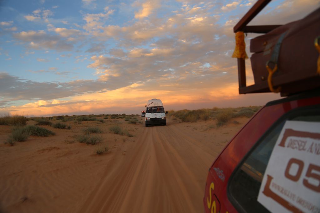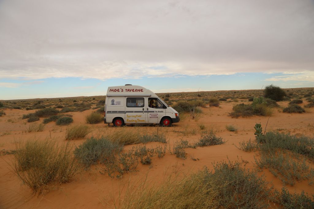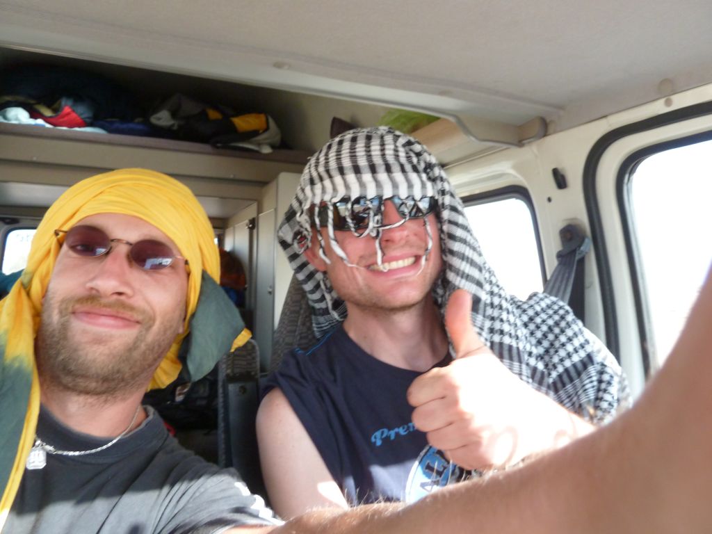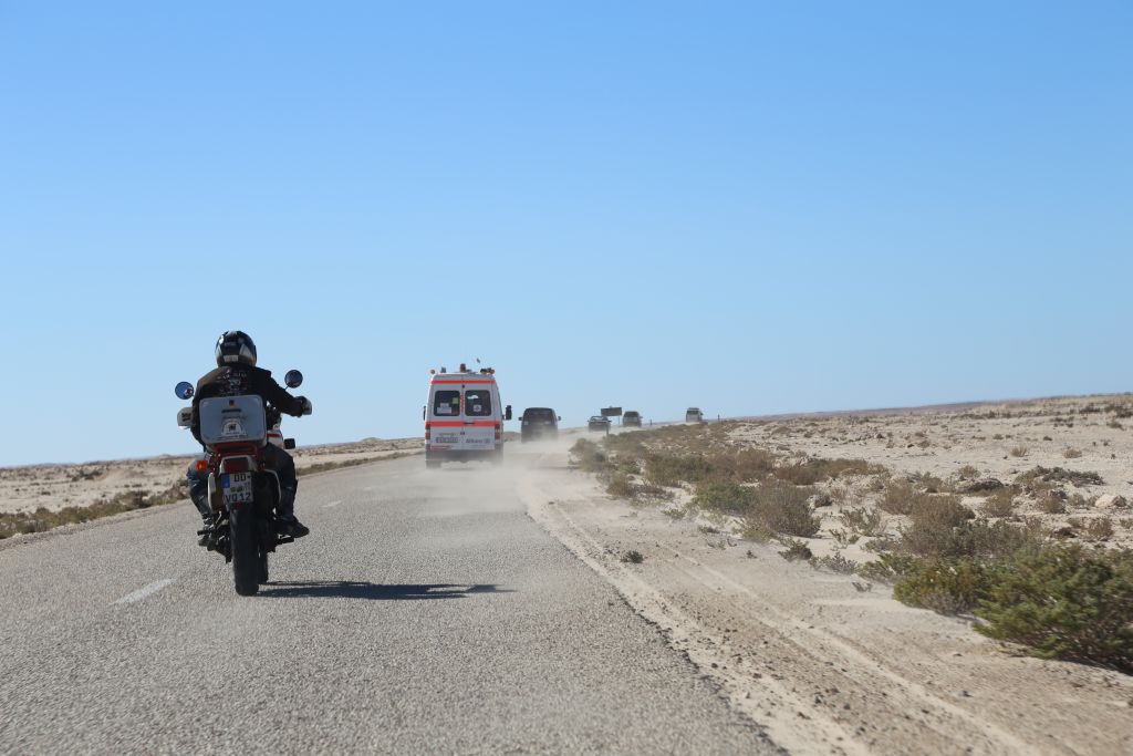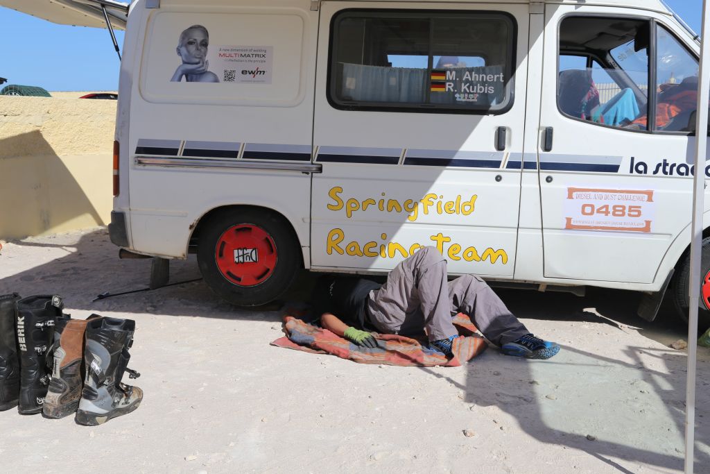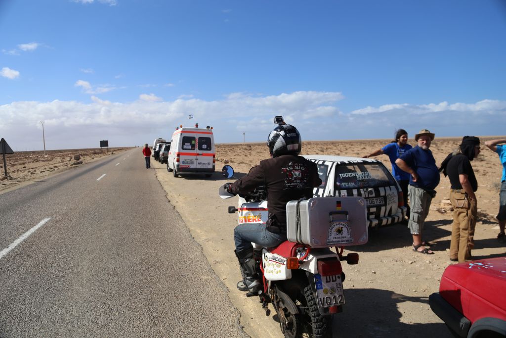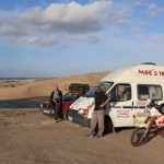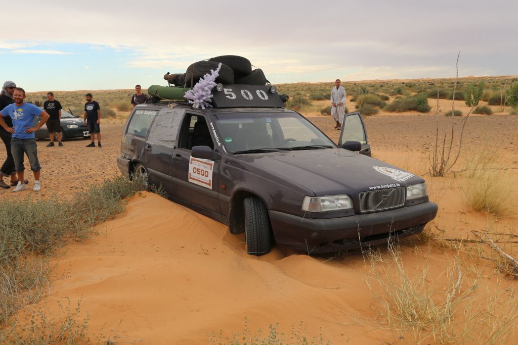 Heute war es endlich soweit!!! Zwar mussten wir uns nochmal 200 km über mauretanische Landstraßen quälen, aber dann war es soweit. Wir bogen von der Straße ab hinein ins Gelände. Nach einem Wüsten-Briefing und einer Mittagspause ging es querfeldein über Sand, kleine Grasbüchel und Kies. Adi im Crosser-Outfit gewöhnt sich langsam an den Sand und kommt super durch. Der Bus fährt sich im Gelände gemütlich und macht sich gut. Auch der Golf kommt prinzipiell gut durch, allerdings ist es hier schon mehr Arbeit… Auch weil nach den ersten paar Kilometern sich der Mittelschalldämpfer vom vorderen Auspuffrohr gelöst hatte. Nun schleifte der Endschalldämpfer auf dem Boden, er musste ab! Mitten in der Wüste wurde mit Hammer und Flex selbiger in nur 30 Minuten entfernt und es konnte weiter gehen. Der Sound ist jetzt noch besser ;-). Nach weiteren 5 km verlor der Golf sein Frontlippe, aber jetzt ist erstmal alles in Ordnung. Achso, dann gab es selbstverständlich auch einige Einsandungen, allerdings nicht von uns. Aber das sind alles Kleinigkeiten, ein anderes Team, ein Audi, hatte seinen hinteren Stoßdämpfer eingebüst. Nach einem kleinen Sprung über eine Sandwelle war dieser in der Mitte zerbrochen. Glücklicherweise gab es einen Ersatzstoßdämpfer von einem weiteren Team. Dieser wird nun eingebaut, hoffentlich funktioniert es. Fortsetzung folgt, da wir mittlerweile das Nachtlager erreicht und eingerichtet haben. Jetzt git es erstmal Nudeln mit Wurst und Tomatensoße. Mal schauen, was morgen alles geschieht…