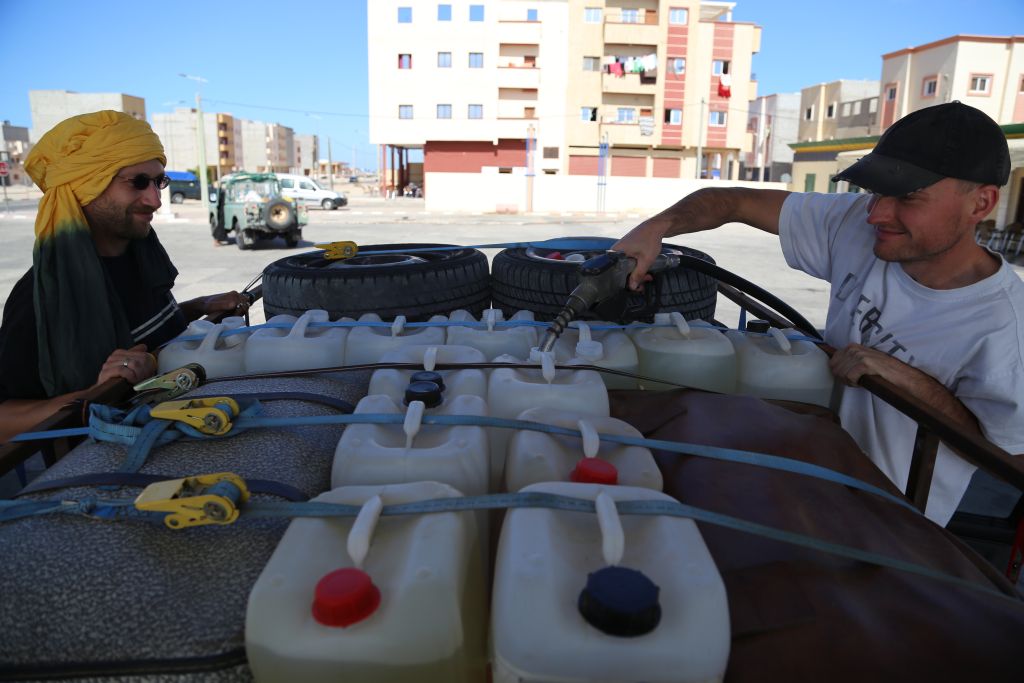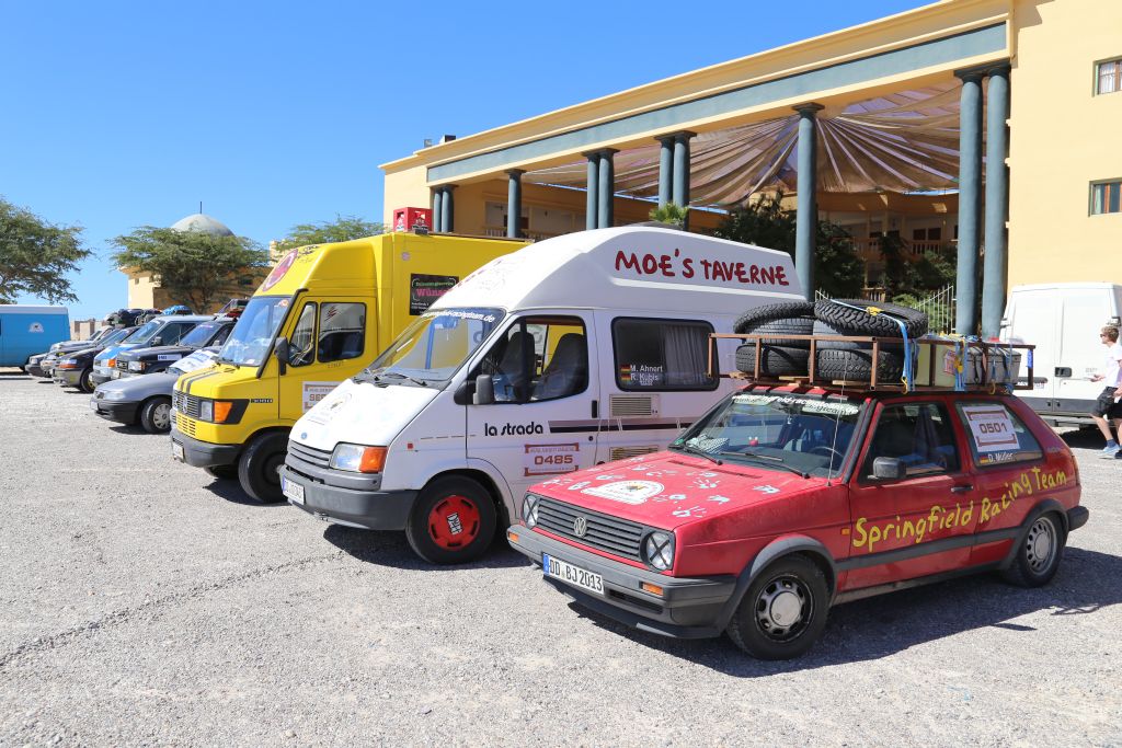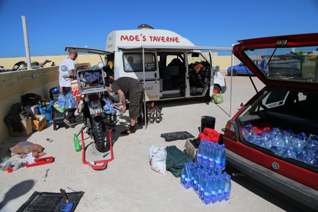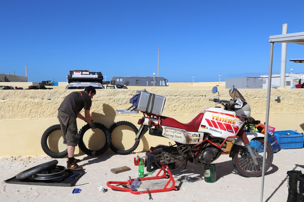 Heute gehts um die Vorbereitung für die 5 Tage in der Wüste. Es gilt so viel Essen, Trinken und Benzin wie möglich zu bunkern und die Fahrzeuge fit für die Wüste zu machen. Ich hab mein Motorrad neue Reifen spendiert und nochmals versucht das Leck zu dichten. Nach vielen Tipps für die Wüsten-Tour von einem erfahrenen Motorradguide und einem großen Einkauf durch die Jungs fühlen wir uns bereit!