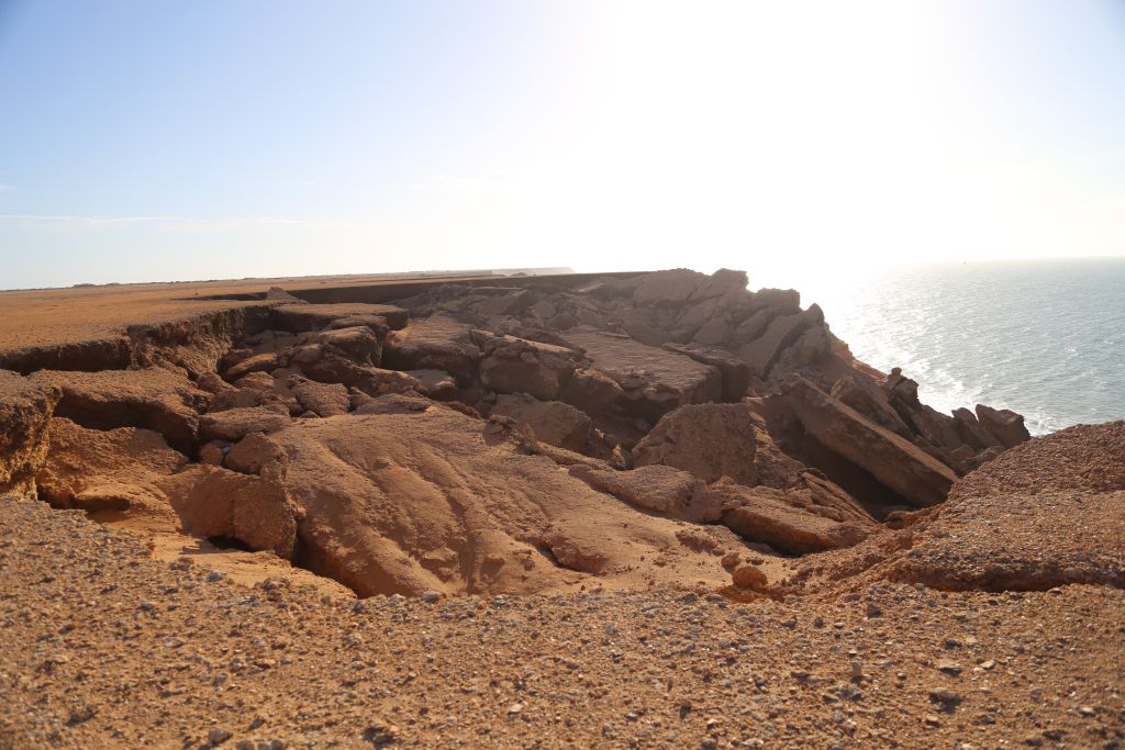 Aus dem Beduinen-Camp, mit einem guten Frühstück als Start, ging es los zur letzten Etappe auf festen asphaltierten Straßen. Der Wind blies heftig und wirbelte viel Sand auf die Straße, was nicht ungefährlich ist. Die Steilküste ist atemberaubend und nach einigen Fotostops erreichen wir Dakhla und zum ersten mal eine Etappe bei Tageslicht.
