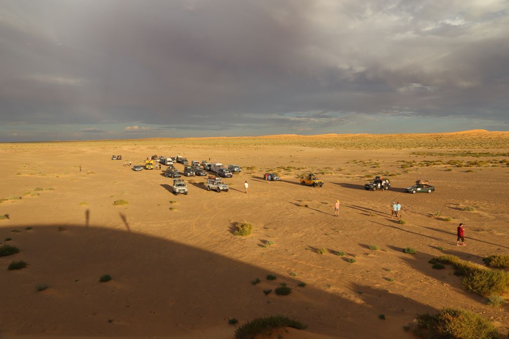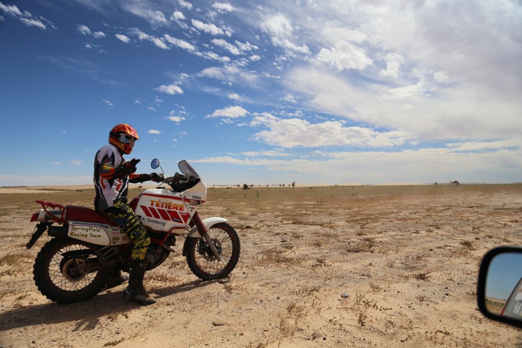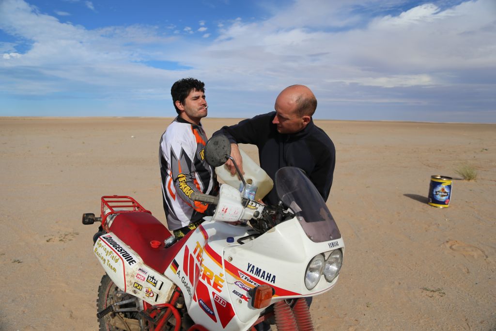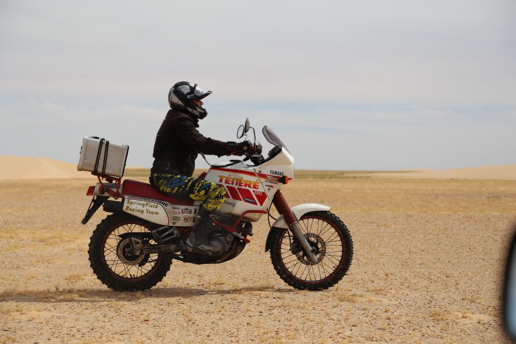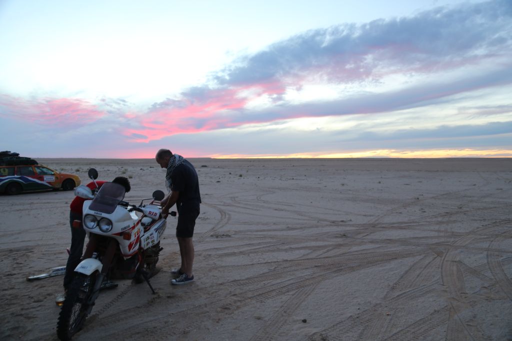 Nach einer kurzen Nacht, weil relativ langen Feier mit unseren bayrischen Freunden, die uns schon vor 2 Jahren begleitet haben, ging es los in die weiten der Wüste. Schon nach wenigen Kilometer der erste Stopp. Einige haben ihr Unterbodenblech verloren und ich meine erste Schrecksekunde mit dem Motorrad hinter mir! Nach einigen mächtigen Sprüngen durch Kamelgras konnte ich das Motorrad nicht mehr abfangen und flog mit einer 1a-Vorwärtsrolle über dem Motorrad ab. Zum Glück ist nicht viel passiert, außer der Bremshebel ist abgebrochen, eine Delle im Tank, meine Fußbremse ist verbogen, in Blinker ist hinüber und mein rechter Rückspiegel ist abgebrochen. Die Tenere springt sofort wieder an und mir ist, Schutzausrüstung sei Dank, nichts passiert (Wüstentaufe bestanden)! Wenig später ging es vorsichtiger weiter und wir arbeiten uns Stück für Stück weiter in die Wüste. Nach vielen Stopps und Einsandungen war Schluss für heute und Torsten, unser KFZ-Meister der Organisatoren, hatte wieder für die Nacht Arbeit und musste einen Kühler eines Fords mit Dichtmasse stopfen. Nach einer leckeren Couscous-Pfanne mit Gemüse lassen wir den Tag wieder mit unseren bayrischen Freunden ausklingen.