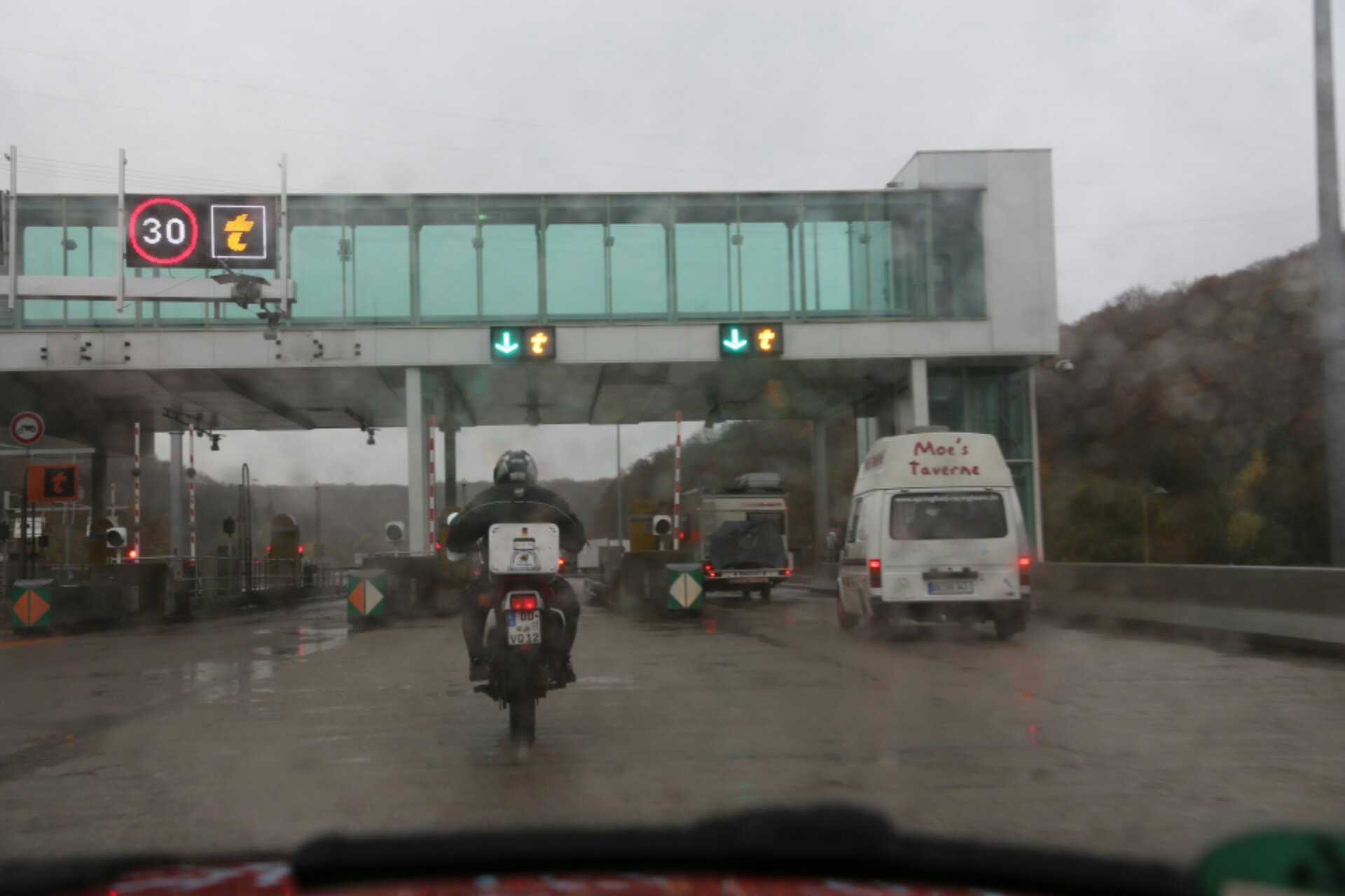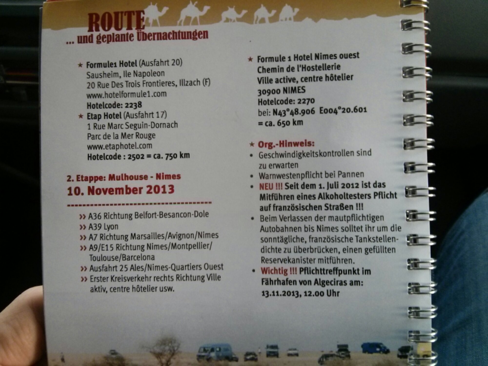 Wir haben es bis Nimes geschafft! Abends gegen halb neun erreichten wir das Hotelgelände im trocknen. Nachdem Adi sich dreimal umgezogen hatte, wurde es dann trockener und schöner, nur der Wind blieb… 850 km über Mulhouse, Dijon und Lyon liegen hinter uns.