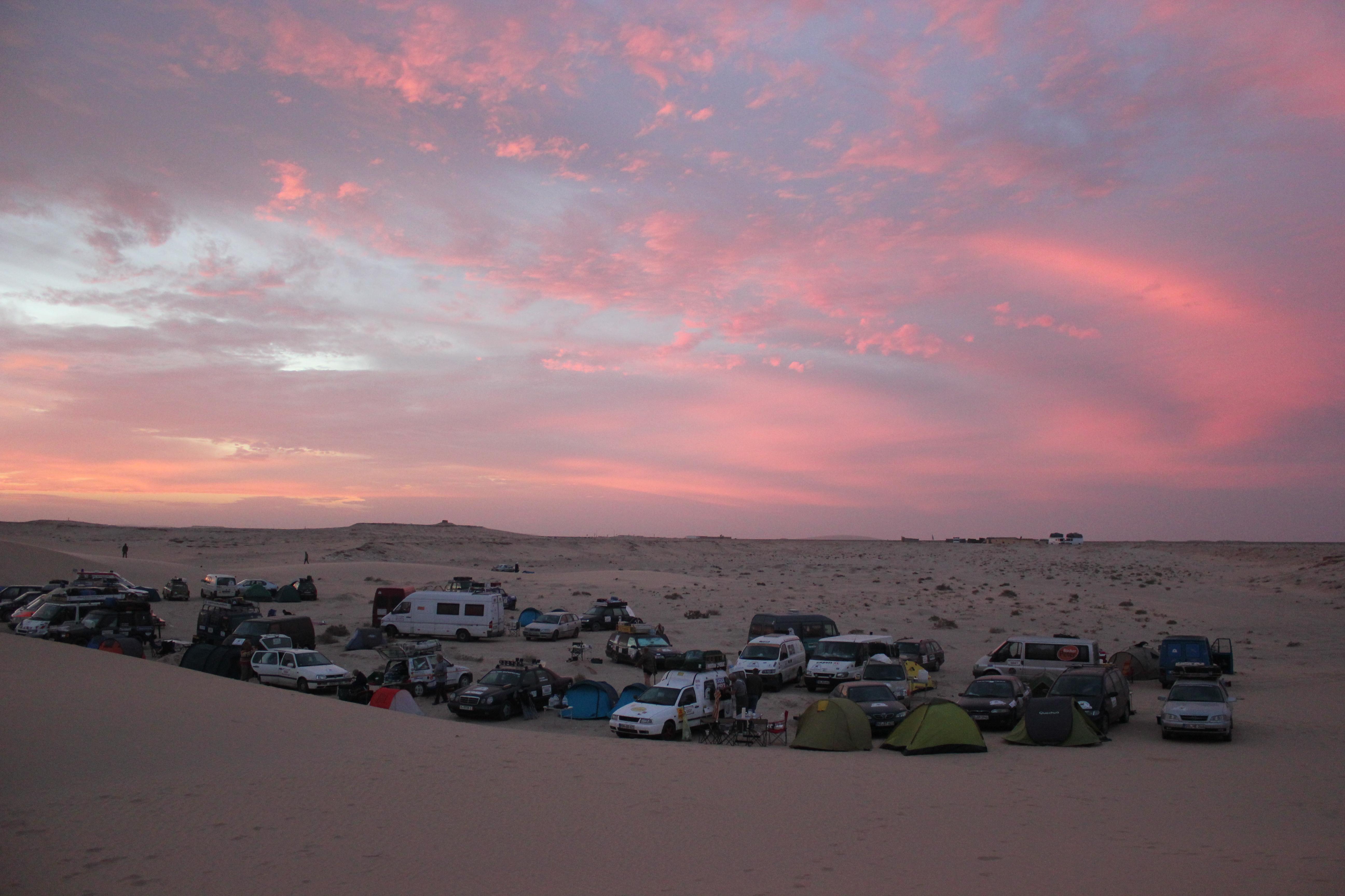 Nach ca. 1 km war Schluss. Die Dämmerung brach heran und da unser Wüstenguide ohne Vorwarnung und für Unerfahrene ohne Briefing einfach in den Tiefsand fuhr, gab es einge viele Einsandungen, sodass wir hinter der nächsten Düne unser Nachtlager aufschlugen.