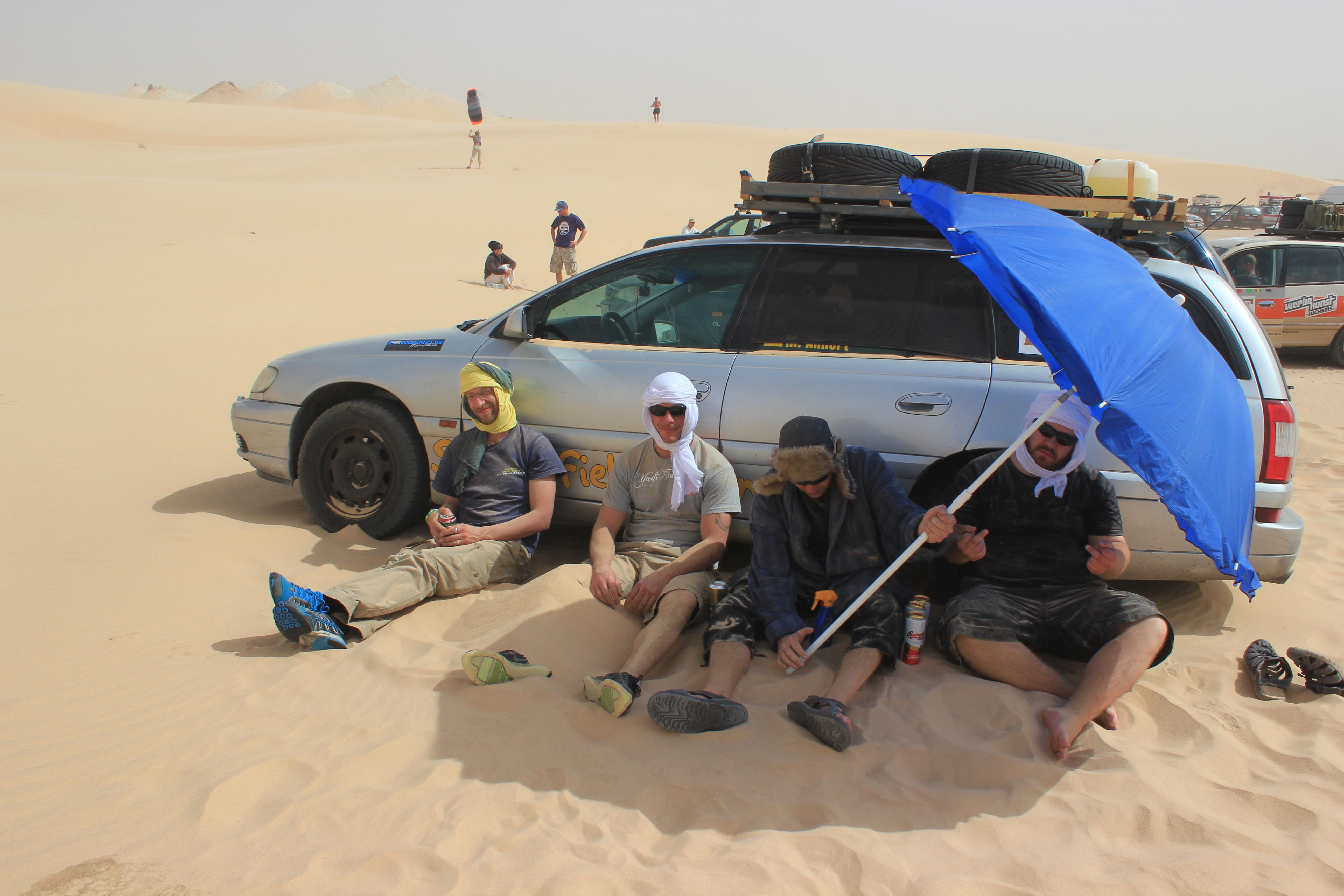 Irgendwann nach endlosen Pausen und weiteren Einsandungen ging es Richtung Nachtlager. Kurz vor dem Nachtlager an einer größeren Sandpassage stand auf einmal ein kleiner Fiat Ciquocento im Sand. Ich kam gerade noch knapp vorbei, Sven sandete sich leider ein. Nach der Passage berichte das Team des E-Klasse Mercedes davon, dass er einen Riss im Querlenker hat… Erstmal weiter fahren und dann schaun mer Mal… Das Nachtlager wurde erreicht. Bei uns und WML gab es erstmal Nudeln mit Tomatensoße. Währenddessen wurde fieberhaft überlegt, wie man dem Mercedes helfen kann. Erste Lösung: Wir Schweißen! Ohne Schweißgerät nicht ganz einfach, also, nehme man vier bis fünf Autobatterien, schalte diese zusammen. Nehme dann einen Schweißdraht und hoffe, das ein Lichtbogen entsteht. Leider funktionierte das Ganze nur kurz und so musste weiter überlegt werden. Zweite Lösung: Den Querlenker „Schienen“.Gesagt, getan!