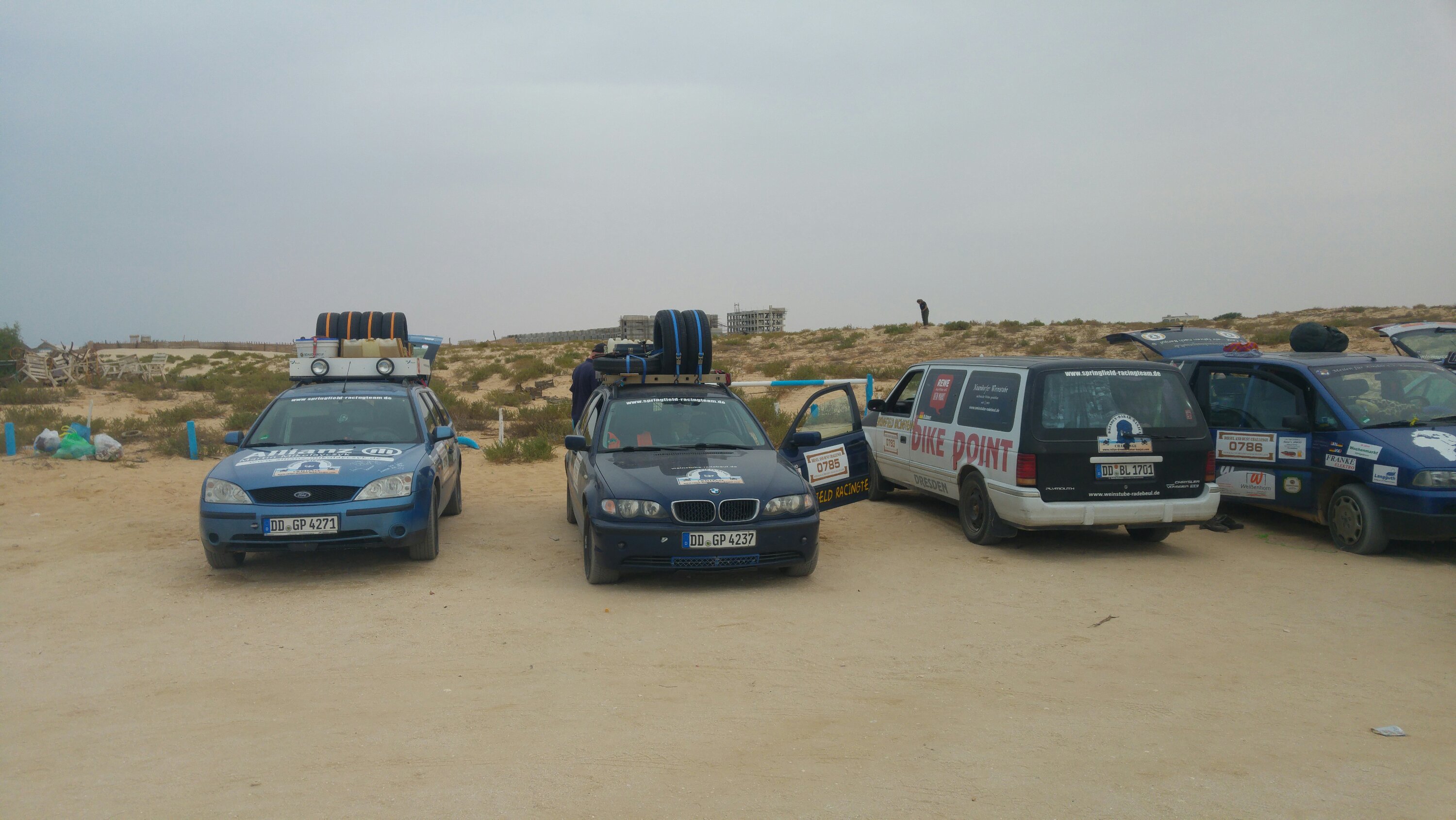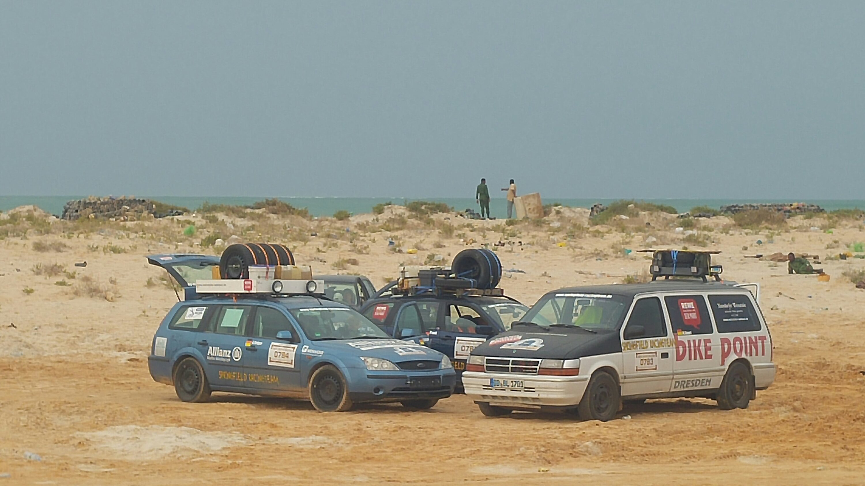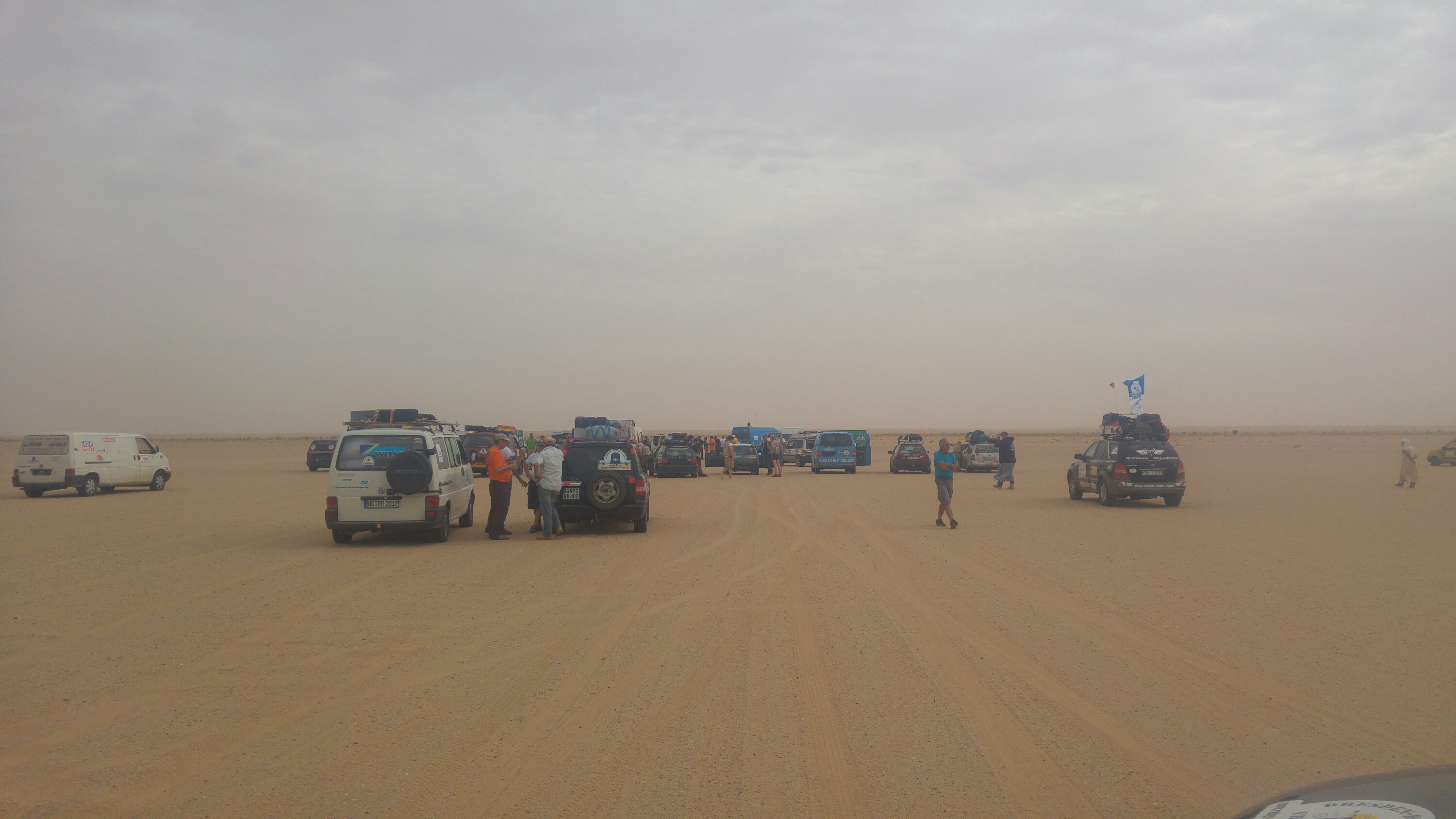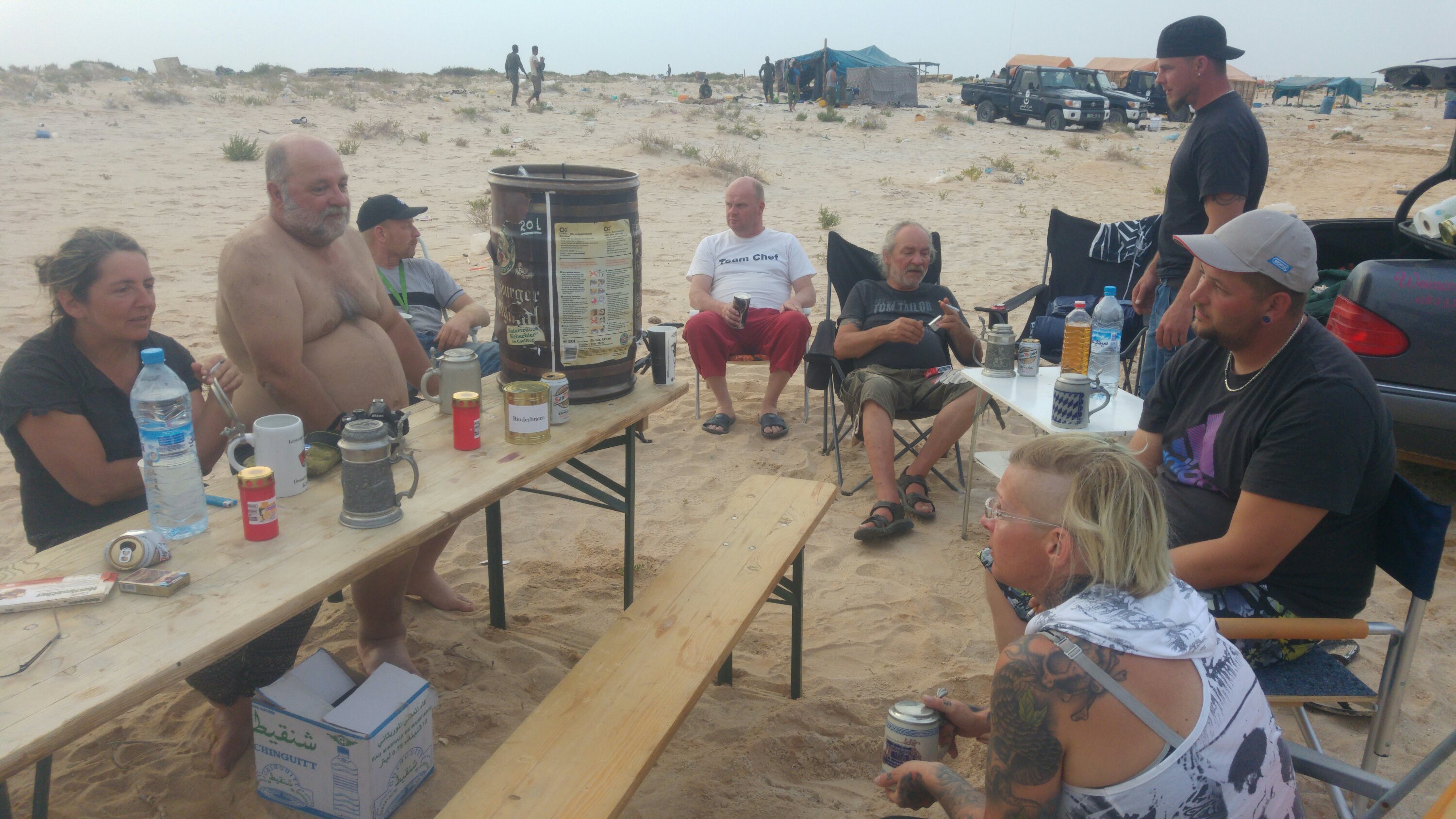 Am heutigen Tag sollte es aus der Wüste raus zum Strand gehen. Daher zeitiges Aufstehen, gegen 8 Uhr war Start angesagt, damit wir genügend Zeit am Strand haben, um das Meer zu beobachten und zu Überlegen, ob eine Strandauffahrt möglich ist. Als erstes standen die zwei weiteren Dünenpassagen an, bevor es auf einer Ebene über die Muscheldüne in ein kleines maurisches Dorf am Atlantik geht. Wie schon erwähnt haben diese es in sich, daher wurde wieder einzeln mit größeren Abständen gestartet. Schon in der ersten Düne blieben ein paar Fahrzeuge stecken. Unter anderem ein Opel Omega, allerdings blieb dieser nicht stecken, sondern liegen… Die Kupplung war hinüber. Das bedeutete Auto ausräumen und bei Torsten (Org) an den Bus hängen. Besagter Opel hatte seine erste Kupplung bereits auf der Fähre in Spanien beim Hochfahren der Rampe zum PKW-Deck eingebüßt. Nach dieser unfreiwilligen Unterbrechung rollten die Autos durch die nächste Düne. Diesmal ohne Probleme. Dann ging es durch eine Ebene und anschließend die sogenannte Muscheldüne hinauf und wieder runter zum Wasser. Trotz vieler großer Bodenwellen und teils felsigem Untergrund, überstanden fast alle diese Herausforderung. Bis auf Roland und Anita von den Kös. Der Kühler tropfte, Kühlerdicht war schnell gefunden und der Kühler wieder dicht. Danach gings zu einem kleinen Fischerdorf an der Küste. Warten. Dorfkinder kamen angerannt und freuten sich riesig über kleine Geschenke. Dieses Mal wurde unser „Parkplatz“ großräumig von den Soldaten abgesperrt, sodass die Kinder nicht durch die Autos laufen konnten. Die Spenden und Geschenke wurden, bewacht und geregelt durch die Soldaten, von den Teams an die Kinder übergeben. Nach einer Weile gab es ein weiteres Briefing. Ein paar Teams, darunter der Omega, machten sich auf der Straße direkt nach Nouakchott. Der Rest fuhr durch nächste Dorf Richtung Strand. Leider stand das Wasser ungünstig und wir mussten hinterm Strand den restlichen Tag verbringen. Ob es morgen auf den Strand geht, muss dann morgen entschieden werden. Die Kös hatten wie immer ein 20 Liter Bierfass dabei und da wir auch noch zu Rindergulasch mit Nudeln eingeladen wurden, verbrachten wir den restlichen Abend bei den Kös.