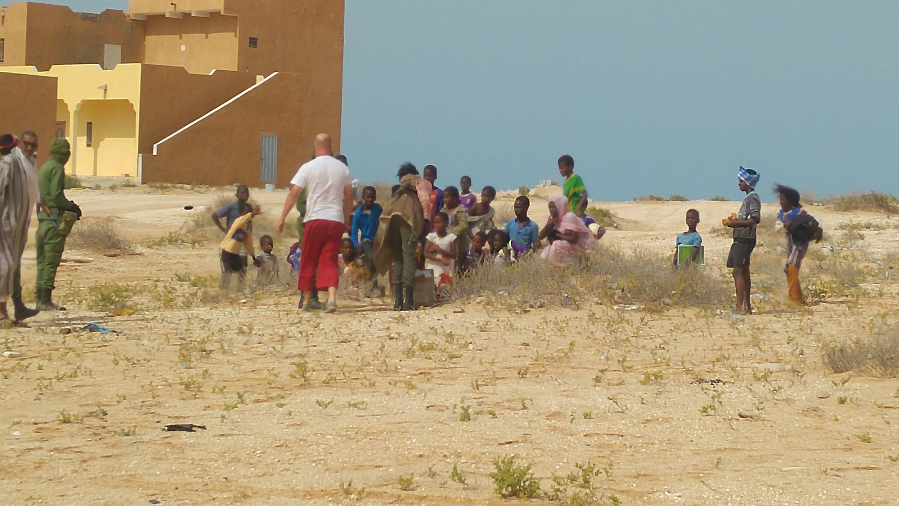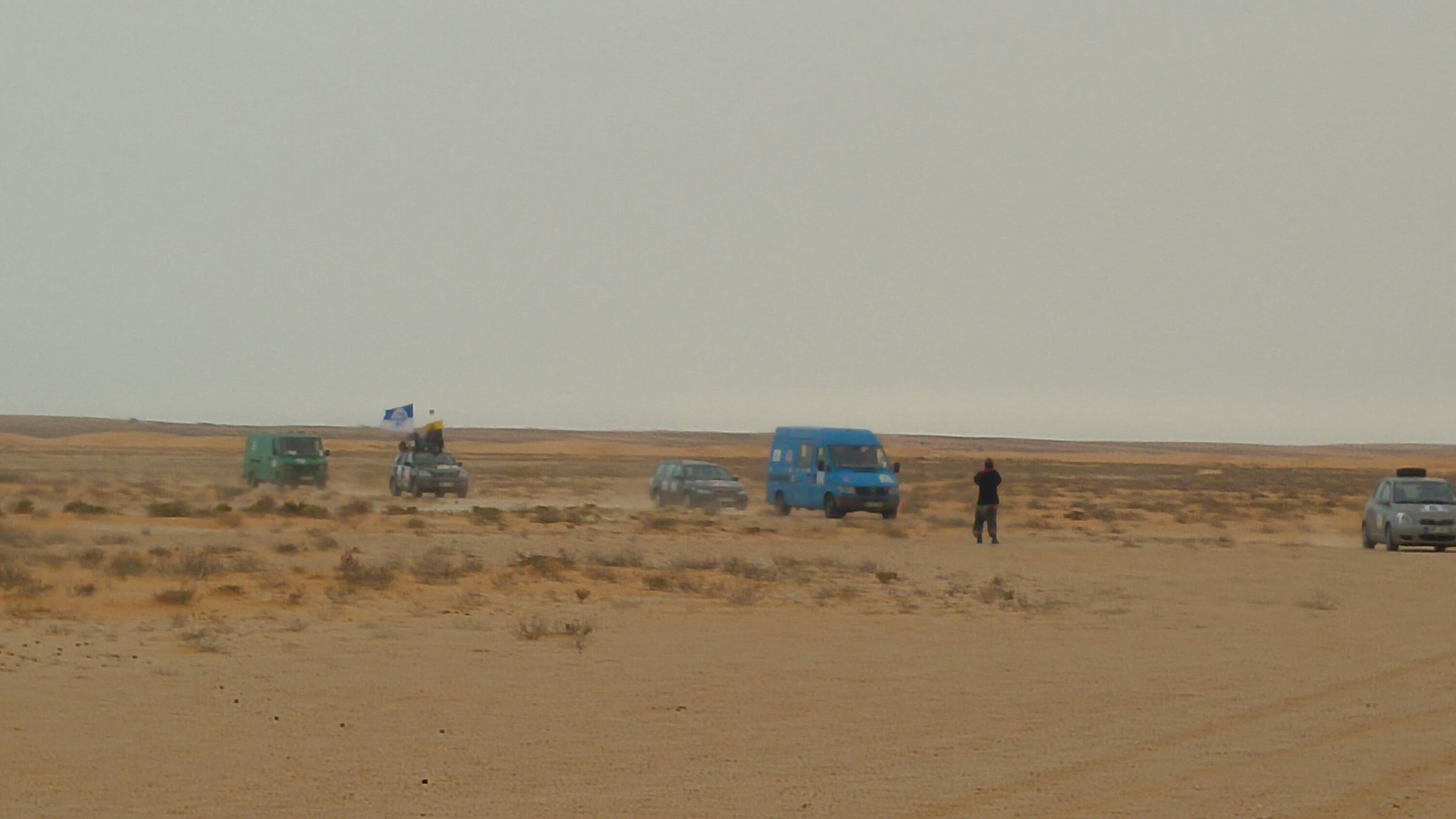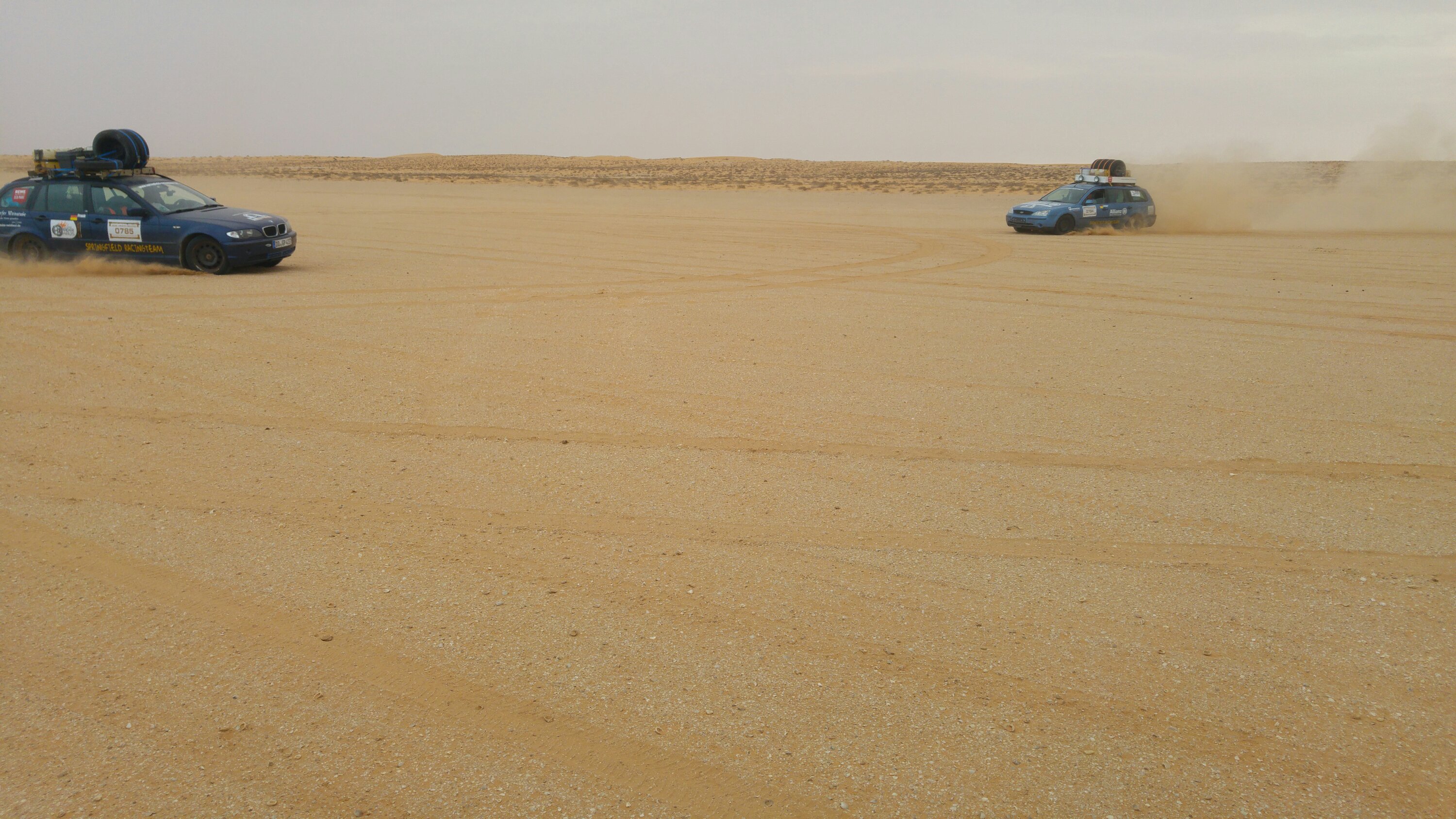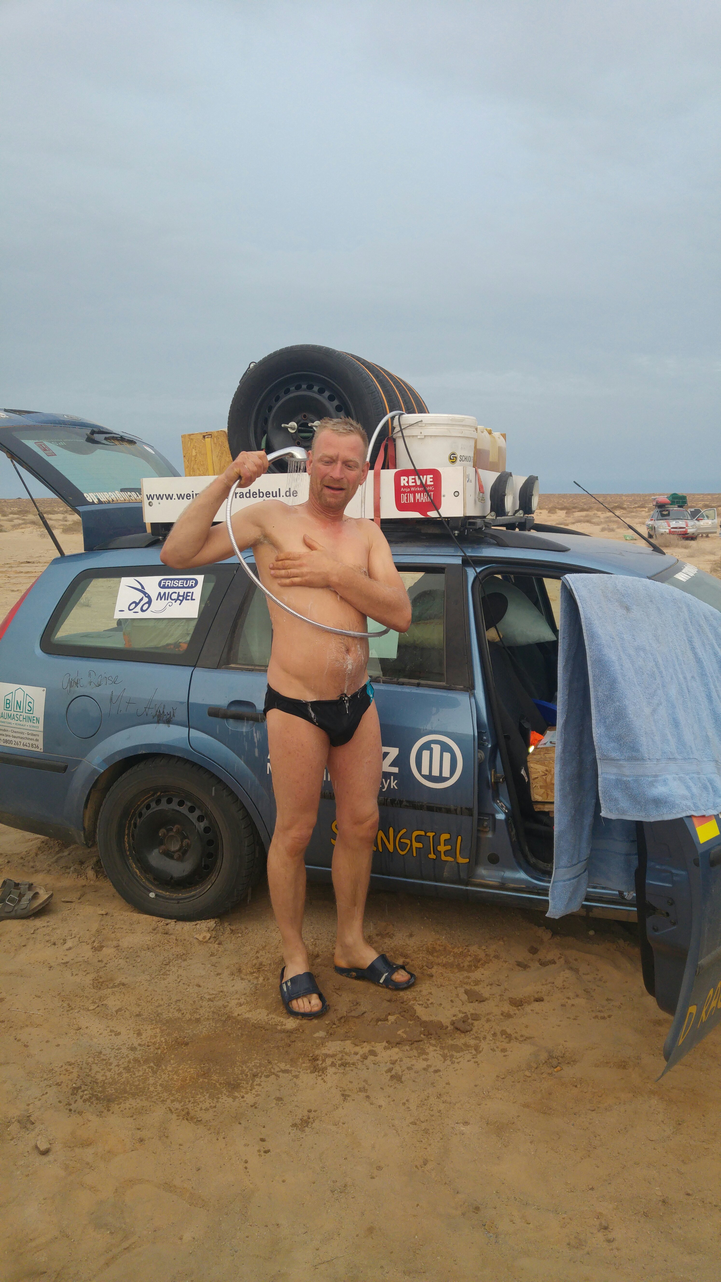 Am heutigen Tag sollte es aus der Wüste raus zum Strand gehen. Daher zeitiges Aufstehen, gegen 8 Uhr war Start angesagt, damit wir genügend Zeit am Strand haben, um das Meer zu beobachten und zu Überlegen, ob eine Strandauffahrt möglich ist. Als erstes standen die zwei weiteren Dünenpassagen an, bevor es auf einer Ebene über die Muscheldüne in ein kleines maurisches Dorf am Atlantik geht. Wie schon erwähnt haben diese es in sich, daher wurde wieder einzeln mit größeren Abständen gestartet. Schon in der ersten Düne blieben ein paar Fahrzeuge stecken. Unter anderem ein Opel Omega, allerdings blieb dieser nicht stecken, sondern liegen… Die Kupplung war hinüber. Das bedeutete Auto ausräumen und bei Torsten (Org) an den Bus hängen. Besagter Opel hatte seine erste Kupplung bereits auf der Fähre in Spanien beim Hochfahren der Rampe zum PKW-Deck eingebüßt. Nach dieser unfreiwilligen Unterbrechung rollten die Autos durch die nächste Düne. Diesmal ohne Probleme. Dann ging es durch eine Ebene und anschließend die sogenannte Muscheldüne hinauf und wieder runter zum Wasser. Trotz vieler großer Bodenwellen und teils felsigem Untergrund, überstanden fast alle diese Herausforderung. Bis auf Roland und Anita von den Kös. Der Kühler tropfte, Kühlerdicht war schnell gefunden und der Kühler wieder dicht. Danach gings zu einem kleinen Fischerdorf an der Küste. Warten. Dorfkinder kamen angerannt und freuten sich riesig über kleine Geschenke. Dieses Mal wurde unser „Parkplatz“ großräumig von den Soldaten abgesperrt, sodass die Kinder nicht durch die Autos laufen konnten. Die Spenden und Geschenke wurden, bewacht und geregelt durch die Soldaten, von den Teams an die Kinder übergeben. Nach einer Weile gab es ein weiteres Briefing. Ein paar Teams, darunter der Omega, machten sich auf der Straße direkt nach Nouakchott. Der Rest fuhr durch nächste Dorf Richtung Strand. Leider stand das Wasser ungünstig und wir mussten hinterm Strand den restlichen Tag verbringen. Ob es morgen auf den Strand geht, muss dann morgen entschieden werden. Die Kös hatten wie immer ein 20 Liter Bierfass dabei und da wir auch noch zu Rindergulasch mit Nudeln eingeladen wurden, verbrachten wir den restlichen Abend bei den Kös.