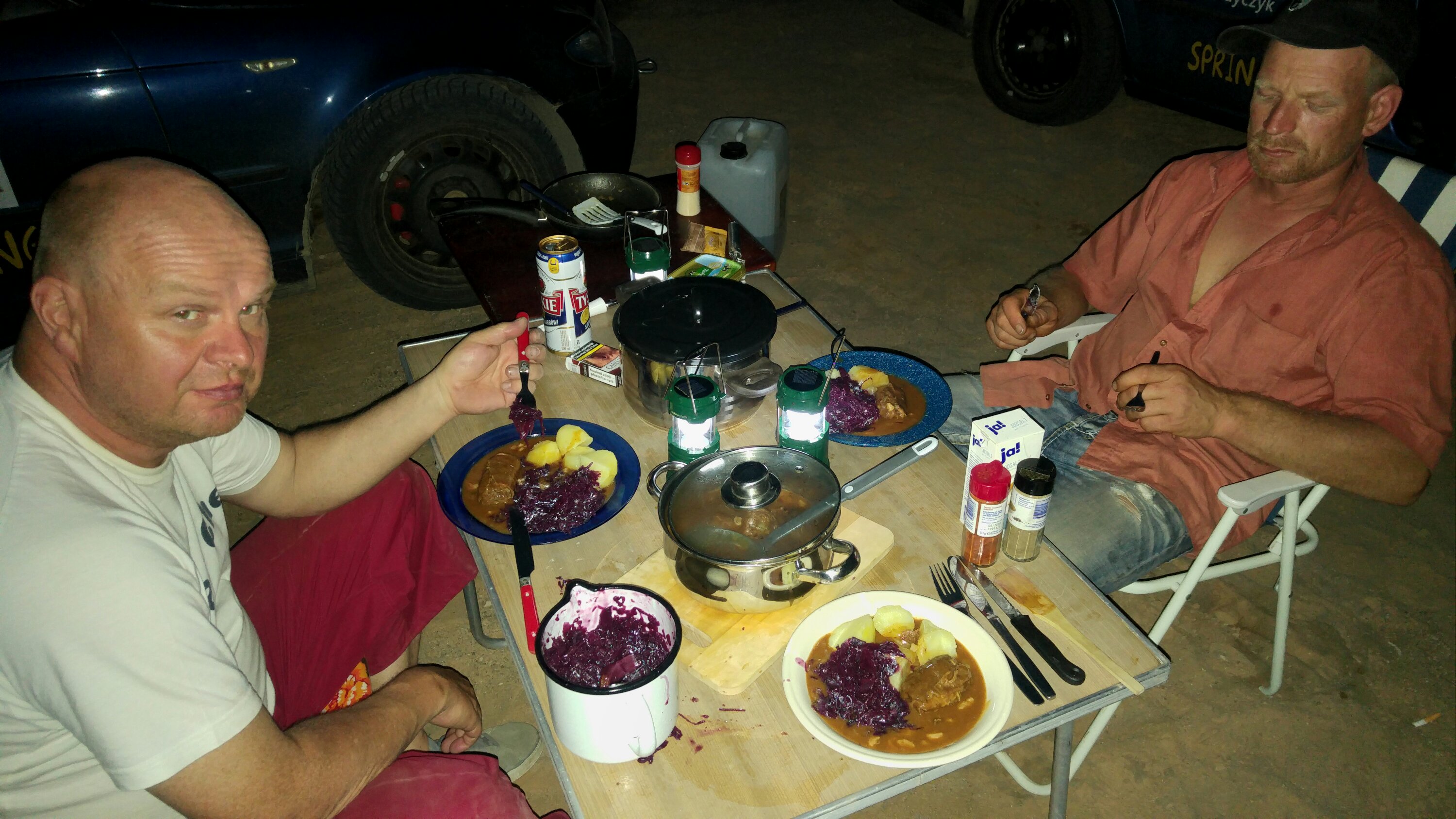 Heute durften wir „ausschlafen“, gegen 10 Uhr war Abfahrt anvisiert. Da wir am Vormittag noch ein letztes Mal in die Nähe der Straße kommen, musste für ein paar Teams die Entscheidung getroffen werden, auf der Straße nach Nouakchott oder doch durch die Wüste. Ein Team, das mit dem defekten Kühler entschied sich auf der Straße weiter zu fahren. Für alle anderen ging es immer weiter rein… Nach den ersten Offroad- und Wüstenerfahrungen des gestrigen Tages, ging es heute recht geordnet zu. Nur wenige Einsandungen und keine größeren Beschädigungen. So erreichten wir recht zügig die Passage „Die drei Dünen“. Bei den letzten Rallyes hatten wir vor der Passage unser Nachtlager errichtet. Diesmal war noch Zeit, sodass wir noch die erste Dünenpassage durchqueren konnten. Auf dieser ca. 5 km langen Strecke gibt es immer wieder Tiefsand durch die sich die Fahrzeuge kämpfen müssen. Mit ein paar Einsandungen haben es dann aber doch kurz vorm Untergehen der Sonne alle geschafft. Also Nachtlager aufschlagen und Abendessen machen. Für uns stand heute etwas besonderes auf dem Speiseplan… Rinderrouladen mit Rotkraut und Kartoffeln! Mmh, sehr lecker!