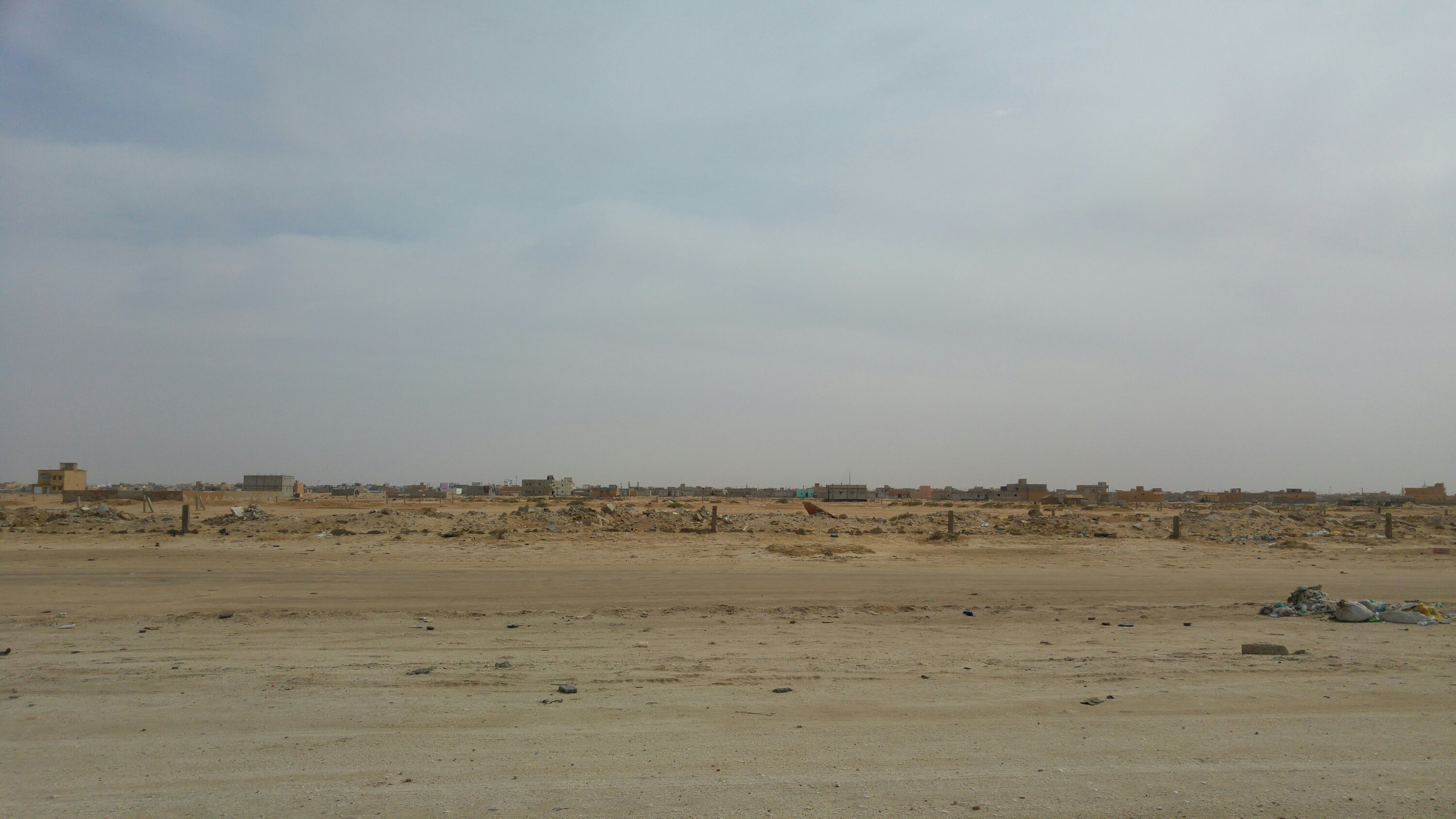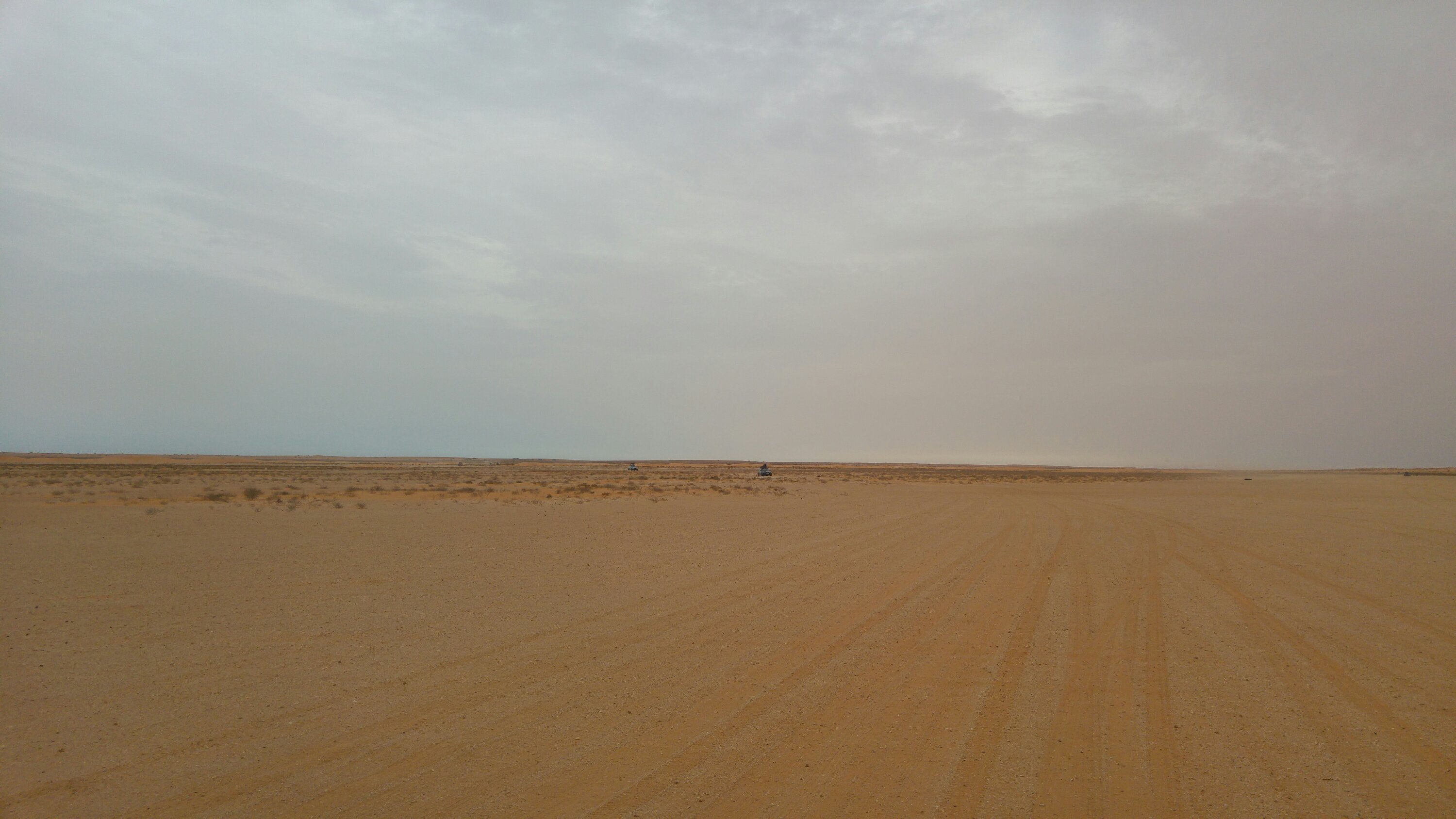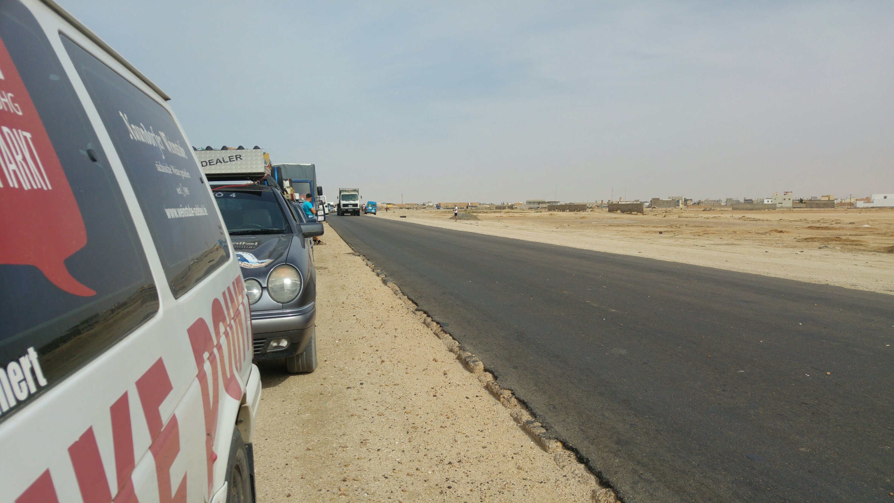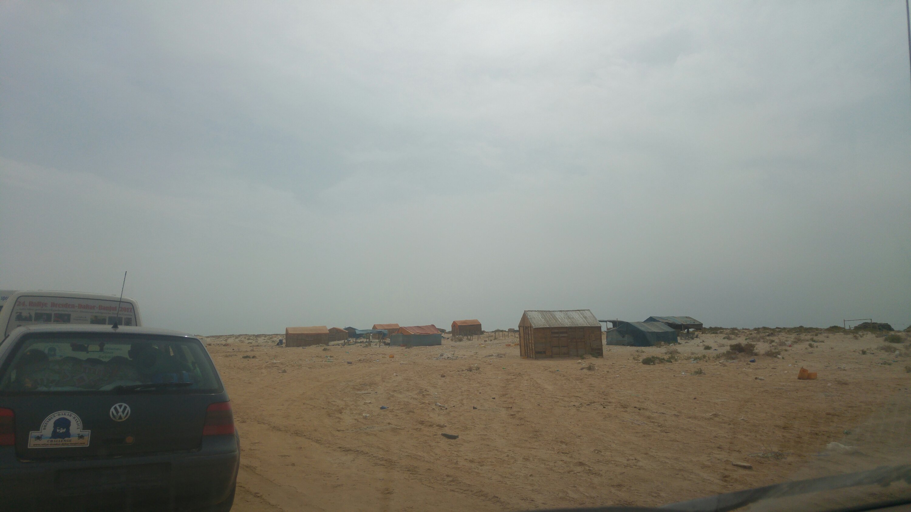 Um 8 Uhr sollte Abfahrbereitschaft hergestellt werden. Vielleicht klappt ja die Strandauffahrt… Gegen 10 Uhr rührte sich dann langsam etwas. Die Orgs sahen immer mal wieder nach dem Wasser, aber eine richtige Veränderung stellte sich nicht ein. Angeblich war Ebbe, aber der befahrbare Streifen direkt an der Wasserlinie war nur wenige Meter breit. Viel zu schmal und riskant wäre da ein Strandfahrt gewesen. Das Zeitfenster viel zu gering um ca. 40 Fahrzeuge die 80 km am Strand sicher hinüber zu bringen. Bleibt ein Auto stecken oder hat technische Probleme steht der komplette Troß! Also entschied sich die Ralleygemeinschaft auf der Straße nach Nouakchott zu fahren. Gegen 12 Uhr sollten wir uns dann auf der einzigen Straße vorm Dorf treffen. Reifen aufpumpen und dann ging es los. Ca. 400 km bis Nouakchott, links Wüste, rechts Wüste, hinter dir Wüste, vor dir Wüste und ein schwarzes Band aus Asphalt zieht sich durch den Sand. Ab und an kleine Dörfer. Ansonsten nichts. Gegen 17 Uhr erreichten wir dann den Campingplatz vor den Toren Nouakchotts. Zum Abendbrot gab es dann von der „Campingplatzküche“, Hühnchenkeulen, Maisfladen, Baguette und Gemüsestücke in Brühe. Hat gut geschmeckt. Morgen ist dann Ruhetag für Mensch und Maschine.