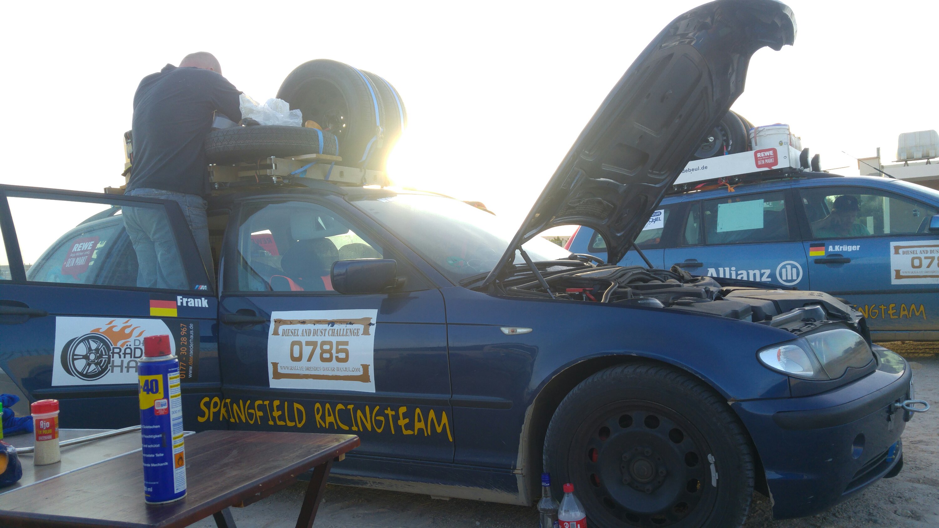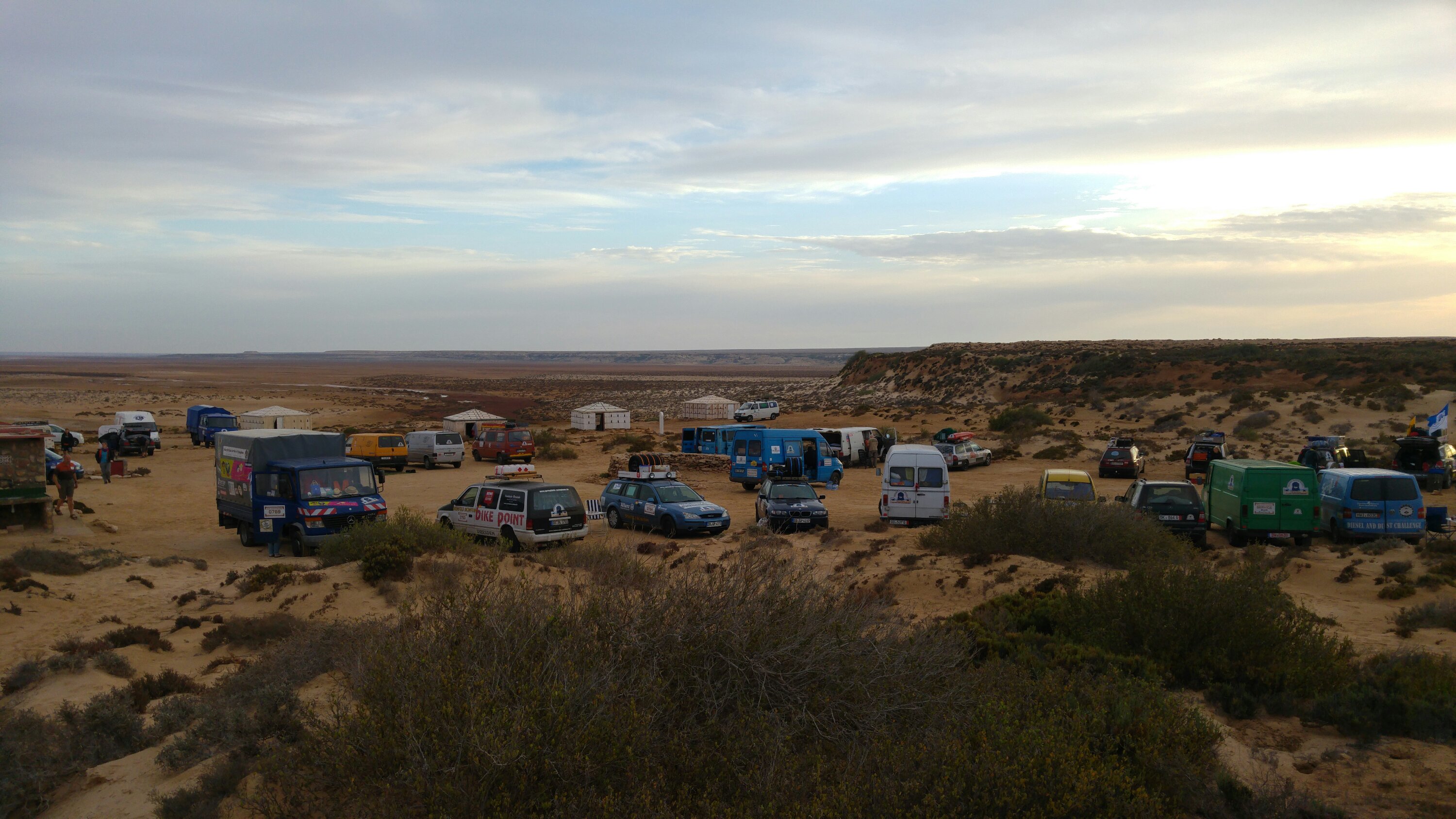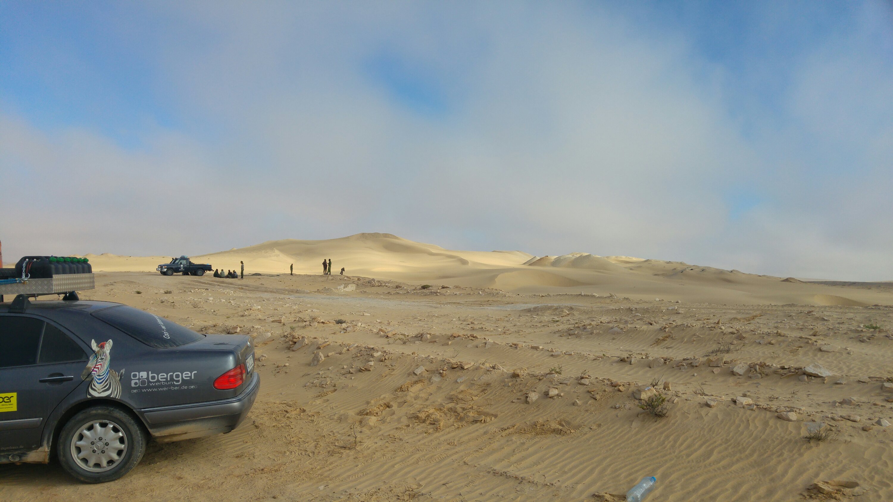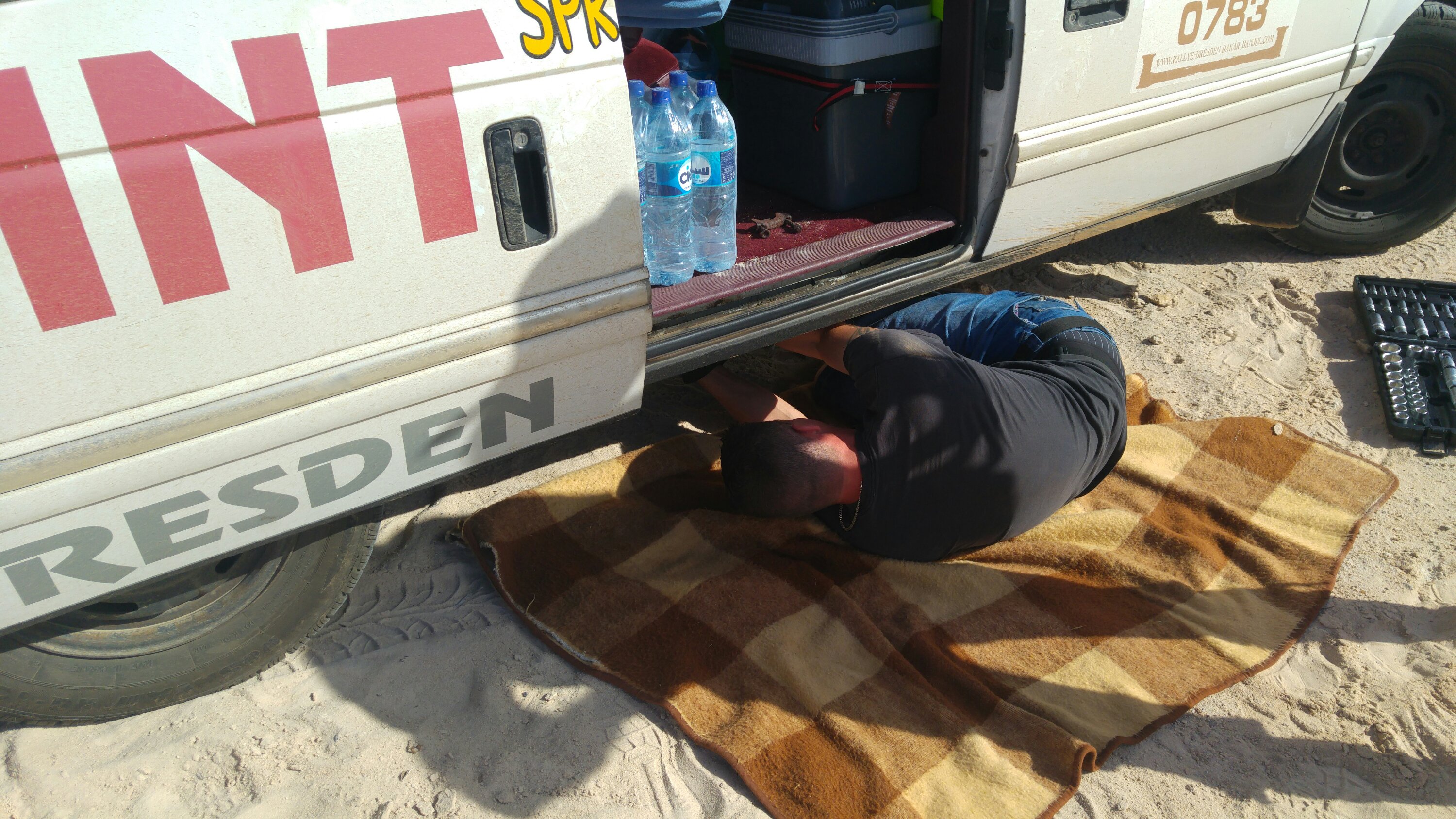 Gegen 10 Uhr ging es nach kurzem Briefing der Orgs zunächst auf die Straße, nach ca. 150 km bogen wir dann rechts in die Wüste ab. Endlich Offroad. Erstmal Mittagspause und dann gings los. Unendliche Weite und viel Sand. Das Führungsfahrzeug mit dem Wüstenguide vorne weg, die anderen hinterher. Kilometer um Kilometer im zügigen Tempo. Dann die ersten Einsandungen, gleich zwei der Kleinlaster (Pritschen) hatte es erwischt. Schieben, Ziehen und nach einer Weile hatte der Sand sie wieder frei gegeben und es konnte weiter gehen. Gegen Nachmittag erreichten wir eine Engstelle an der die Rallyeboliden einzeln durch mussten. Leider waren die Abstände zwischen den Fahrzeugen zu gering, sodass es zu weiteren Einsandungen kam. Erschwerend hinzu kam der felsige Untergrund mit vielen, teils größeren, Steinen. Als sich alle durch diese Passage gemogelt hatten, gab es eine erste Bestandsaufnahme… Ein Tank gerissen, ein Schlauch von der Servopumpe gerissen, eine Benzinleitung abgerissen und ein Kühler aufgerissen. Bei unseren drei Boliden alles bestens! Das bedeutete Nachtlager aufschlagen und die defekten Wagen reparieren. Die Servopumpe war schnell repariert. Aus dem Tank musste erstmal der Sprit abgelassen werden bevor er geklebt werden konnte. Da wir gut ausgestattet sind und Alex eine Benzinpumpe dabei hat, war der Sprit schnell raus. Dann konnte er mit Franks Zauberkleber geklebt werden. Am nächsten morgen war er wieder dicht. Unsere Werkstattausrüstung wurde schon bis hierher mehrfach benötigt und wurde auch von den Orgs immer mal wieder benutzt. Bei den anderen beiden Autos dauerte es etwas länger. Nach dem Abendbrot gab es noch ein, zwei Bierchen bevor es zur Nachtruhe ging.