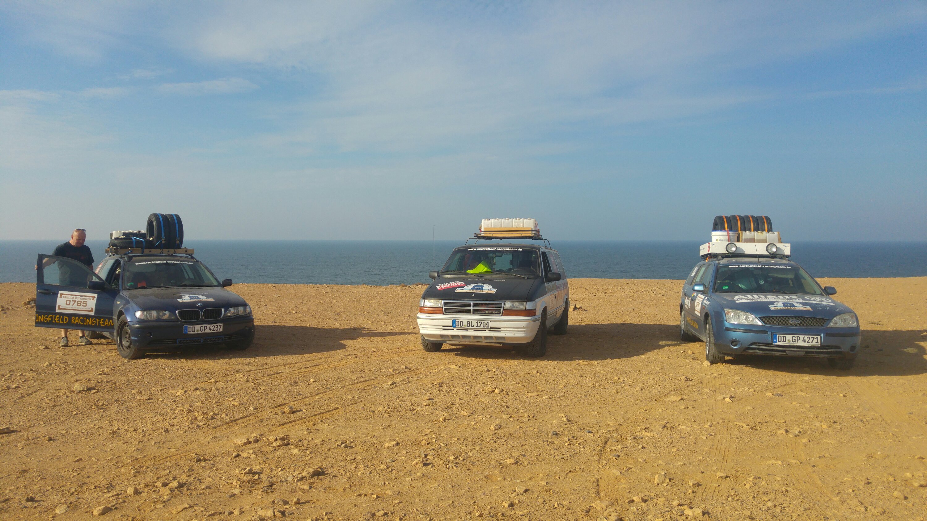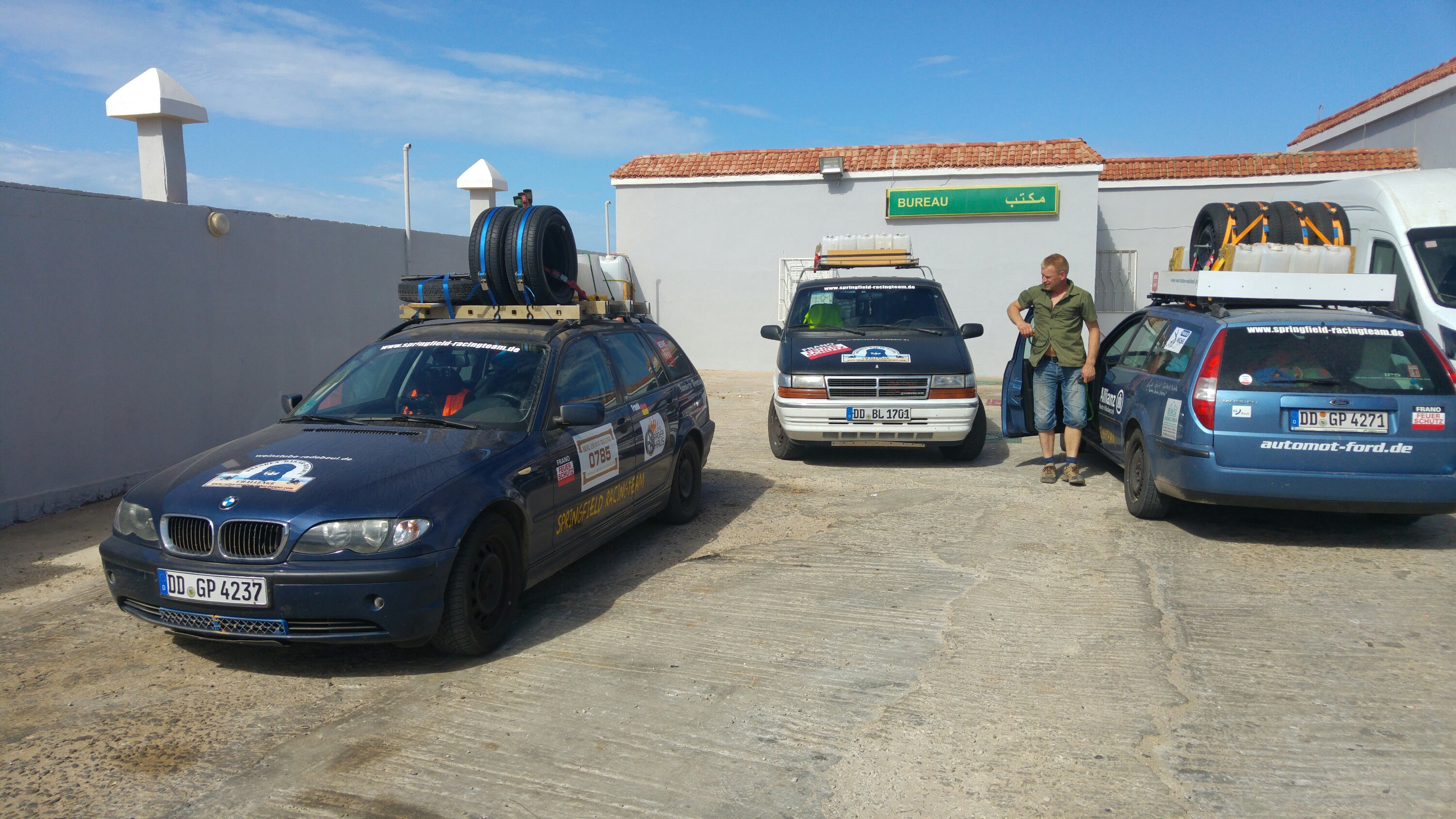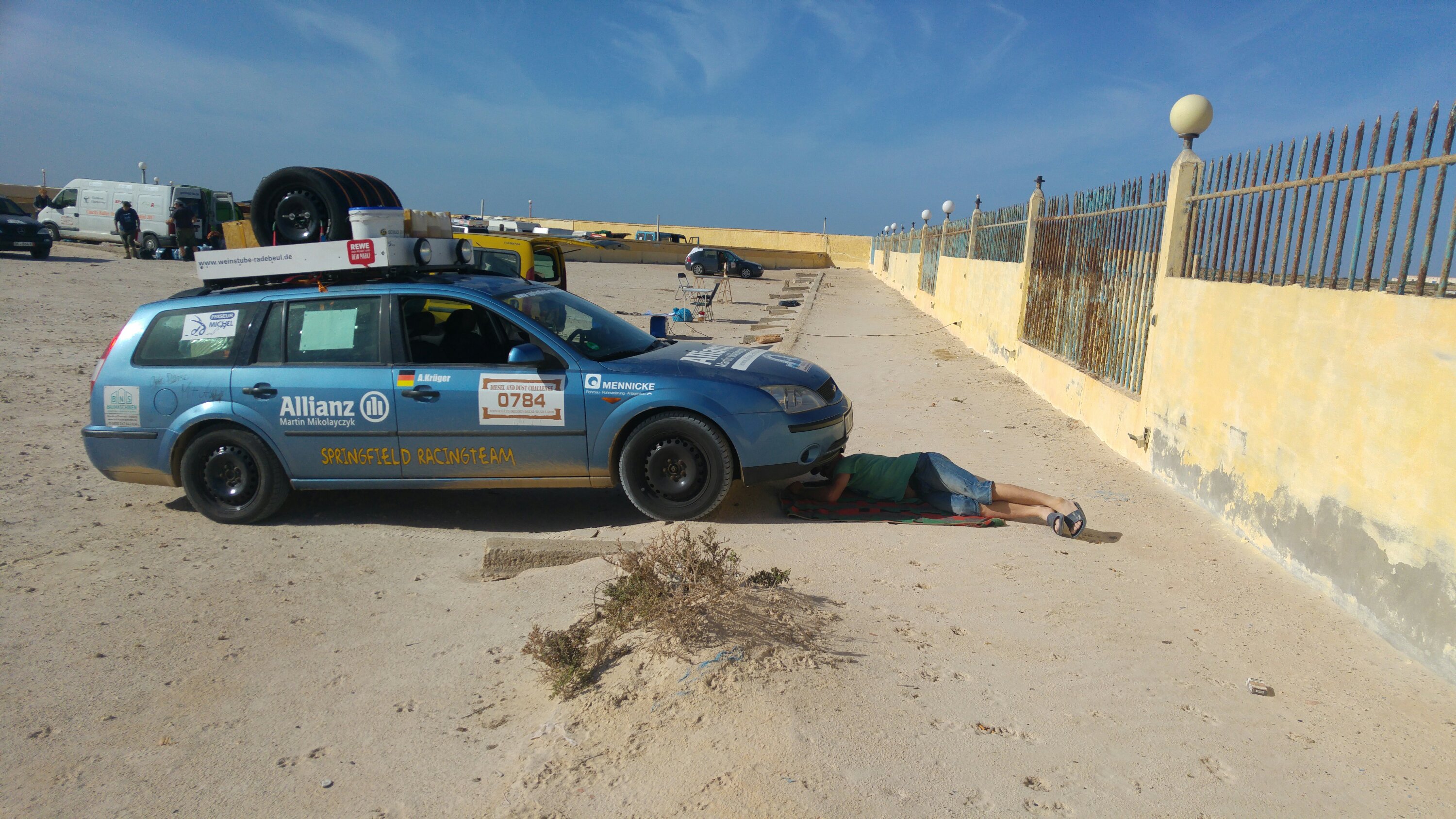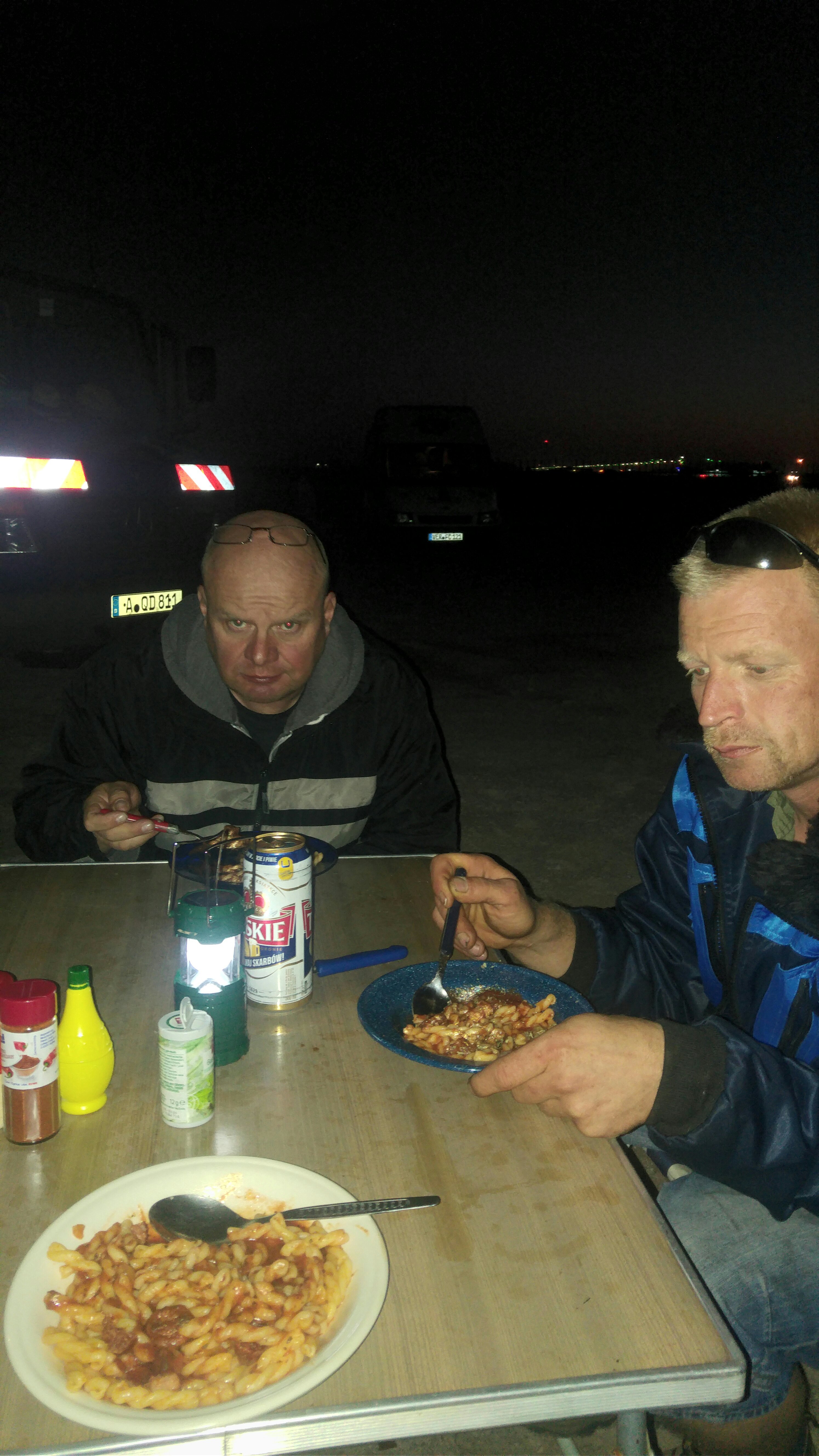 Gegen 10 Uhr ging es nach kurzem Briefing der Orgs zunächst auf die Straße, nach ca. 150 km bogen wir dann rechts in die Wüste ab. Endlich Offroad. Erstmal Mittagspause und dann gings los. Unendliche Weite und viel Sand. Das Führungsfahrzeug mit dem Wüstenguide vorne weg, die anderen hinterher. Kilometer um Kilometer im zügigen Tempo. Dann die ersten Einsandungen, gleich zwei der Kleinlaster (Pritschen) hatte es erwischt. Schieben, Ziehen und nach einer Weile hatte der Sand sie wieder frei gegeben und es konnte weiter gehen. Gegen Nachmittag erreichten wir eine Engstelle an der die Rallyeboliden einzeln durch mussten. Leider waren die Abstände zwischen den Fahrzeugen zu gering, sodass es zu weiteren Einsandungen kam. Erschwerend hinzu kam der felsige Untergrund mit vielen, teils größeren, Steinen. Als sich alle durch diese Passage gemogelt hatten, gab es eine erste Bestandsaufnahme… Ein Tank gerissen, ein Schlauch von der Servopumpe gerissen, eine Benzinleitung abgerissen und ein Kühler aufgerissen. Bei unseren drei Boliden alles bestens! Das bedeutete Nachtlager aufschlagen und die defekten Wagen reparieren. Die Servopumpe war schnell repariert. Aus dem Tank musste erstmal der Sprit abgelassen werden bevor er geklebt werden konnte. Da wir gut ausgestattet sind und Alex eine Benzinpumpe dabei hat, war der Sprit schnell raus. Dann konnte er mit Franks Zauberkleber geklebt werden. Am nächsten morgen war er wieder dicht. Unsere Werkstattausrüstung wurde schon bis hierher mehrfach benötigt und wurde auch von den Orgs immer mal wieder benutzt. Bei den anderen beiden Autos dauerte es etwas länger. Nach dem Abendbrot gab es noch ein, zwei Bierchen bevor es zur Nachtruhe ging.