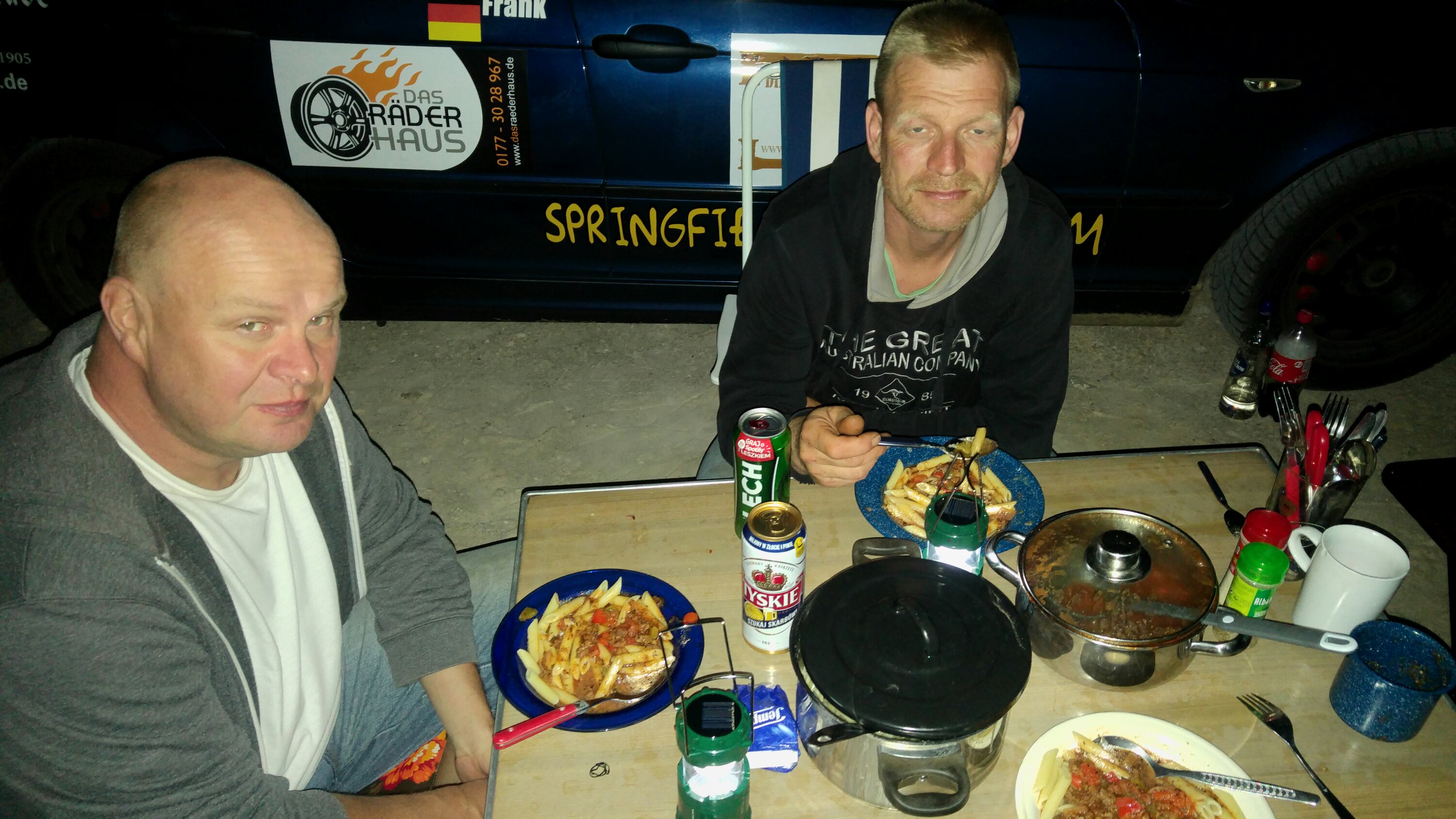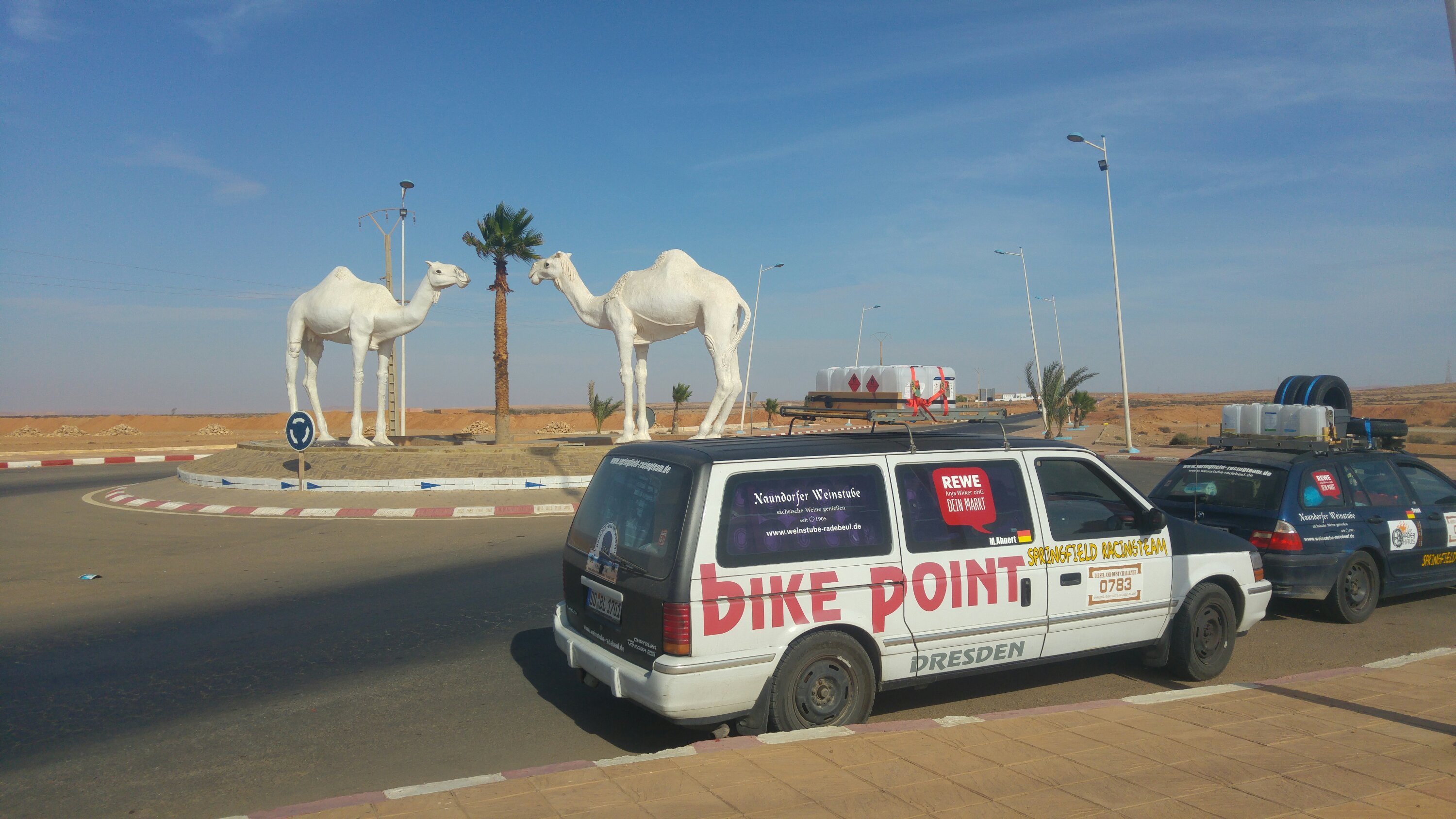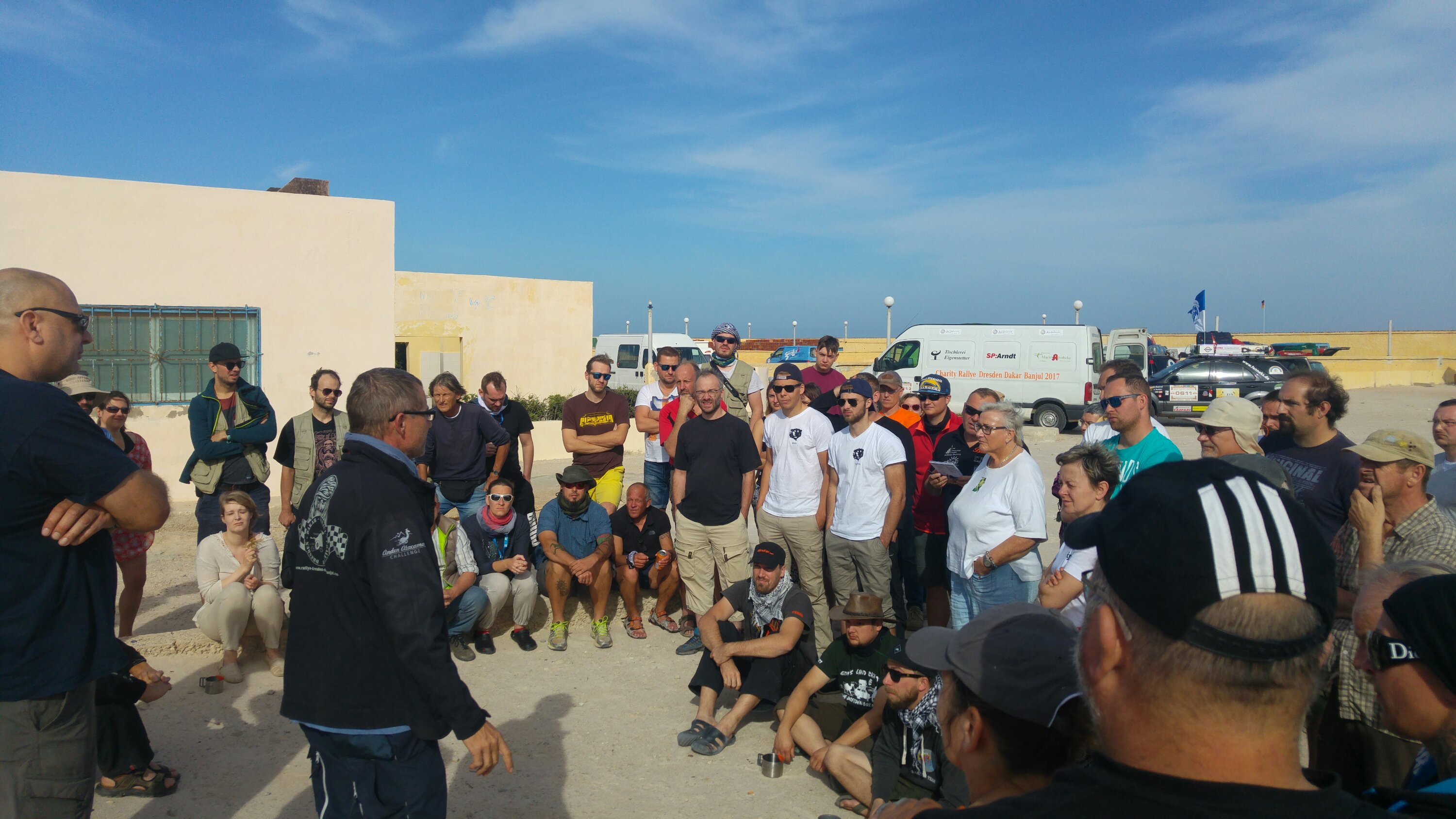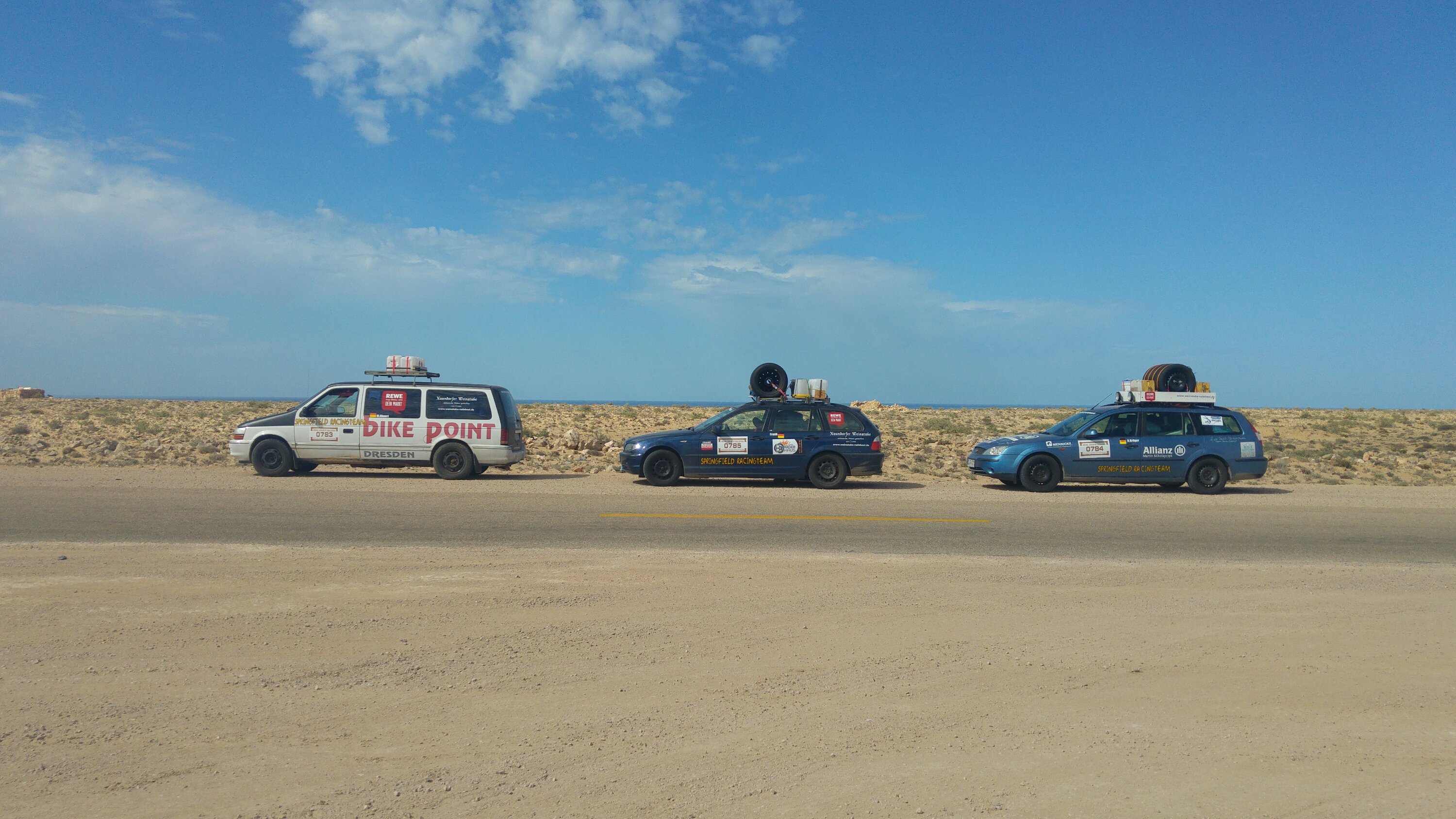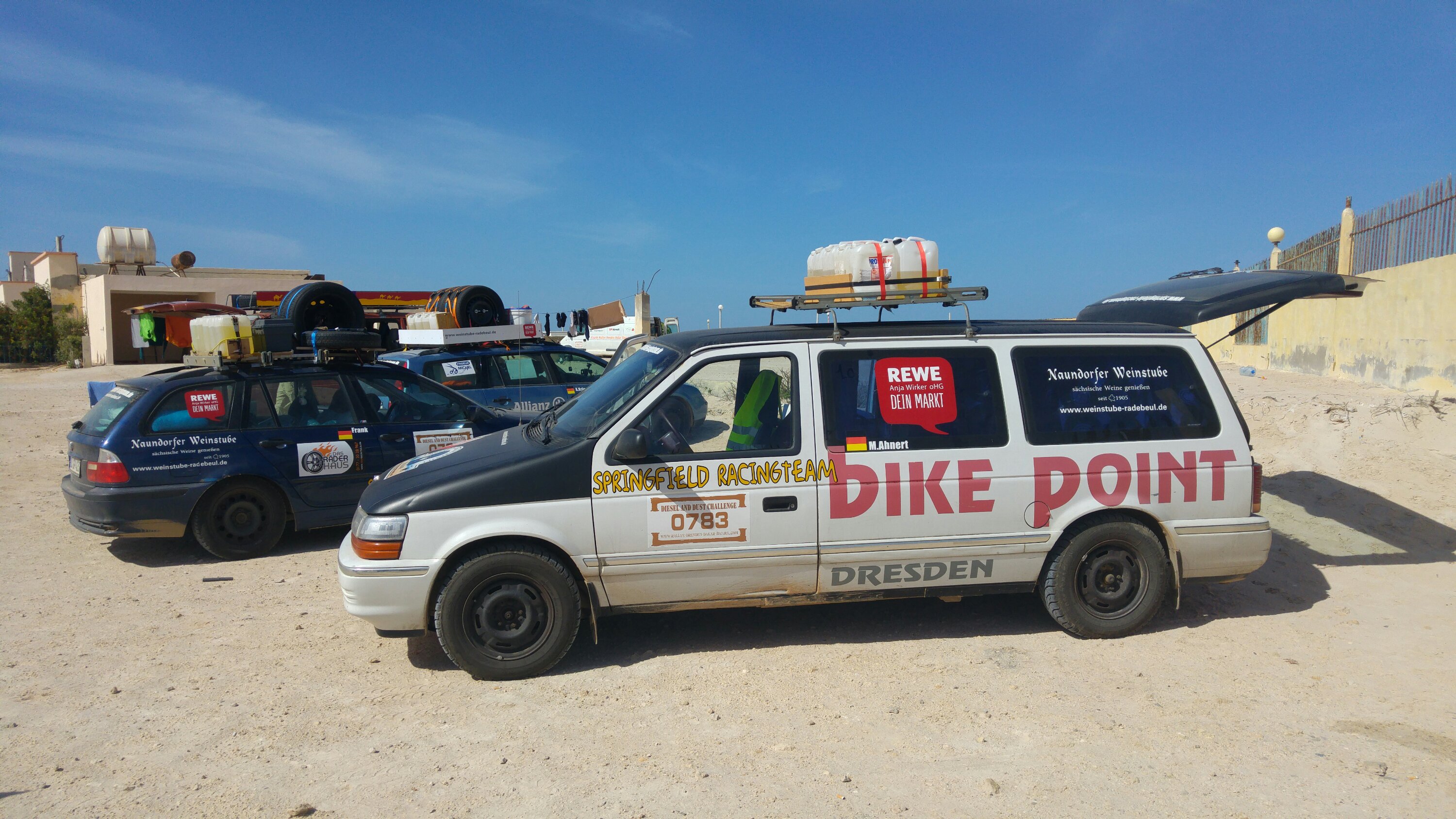 Gegen 10 Uhr ging es nach kurzem Briefing der Orgs zunächst auf die Straße, nach ca. 150 km bogen wir dann rechts in die Wüste ab. Endlich Offroad. Erstmal Mittagspause und dann gings los. Unendliche Weite und viel Sand. Das Führungsfahrzeug mit dem Wüstenguide vorne weg, die anderen hinterher. Kilometer um Kilometer im zügigen Tempo. Dann die ersten Einsandungen, gleich zwei der Kleinlaster (Pritschen) hatte es erwischt. Schieben, Ziehen und nach einer Weile hatte der Sand sie wieder frei gegeben und es konnte weiter gehen. Gegen Nachmittag erreichten wir eine Engstelle an der die Rallyeboliden einzeln durch mussten. Leider waren die Abstände zwischen den Fahrzeugen zu gering, sodass es zu weiteren Einsandungen kam. Erschwerend hinzu kam der felsige Untergrund mit vielen, teils größeren, Steinen. Als sich alle durch diese Passage gemogelt hatten, gab es eine erste Bestandsaufnahme… Ein Tank gerissen, ein Schlauch von der Servopumpe gerissen, eine Benzinleitung abgerissen und ein Kühler aufgerissen. Bei unseren drei Boliden alles bestens! Das bedeutete Nachtlager aufschlagen und die defekten Wagen reparieren. Die Servopumpe war schnell repariert. Aus dem Tank musste erstmal der Sprit abgelassen werden bevor er geklebt werden konnte. Da wir gut ausgestattet sind und Alex eine Benzinpumpe dabei hat, war der Sprit schnell raus. Dann konnte er mit Franks Zauberkleber geklebt werden. Am nächsten morgen war er wieder dicht. Unsere Werkstattausrüstung wurde schon bis hierher mehrfach benötigt und wurde auch von den Orgs immer mal wieder benutzt. Bei den anderen beiden Autos dauerte es etwas länger. Nach dem Abendbrot gab es noch ein, zwei Bierchen bevor es zur Nachtruhe ging.