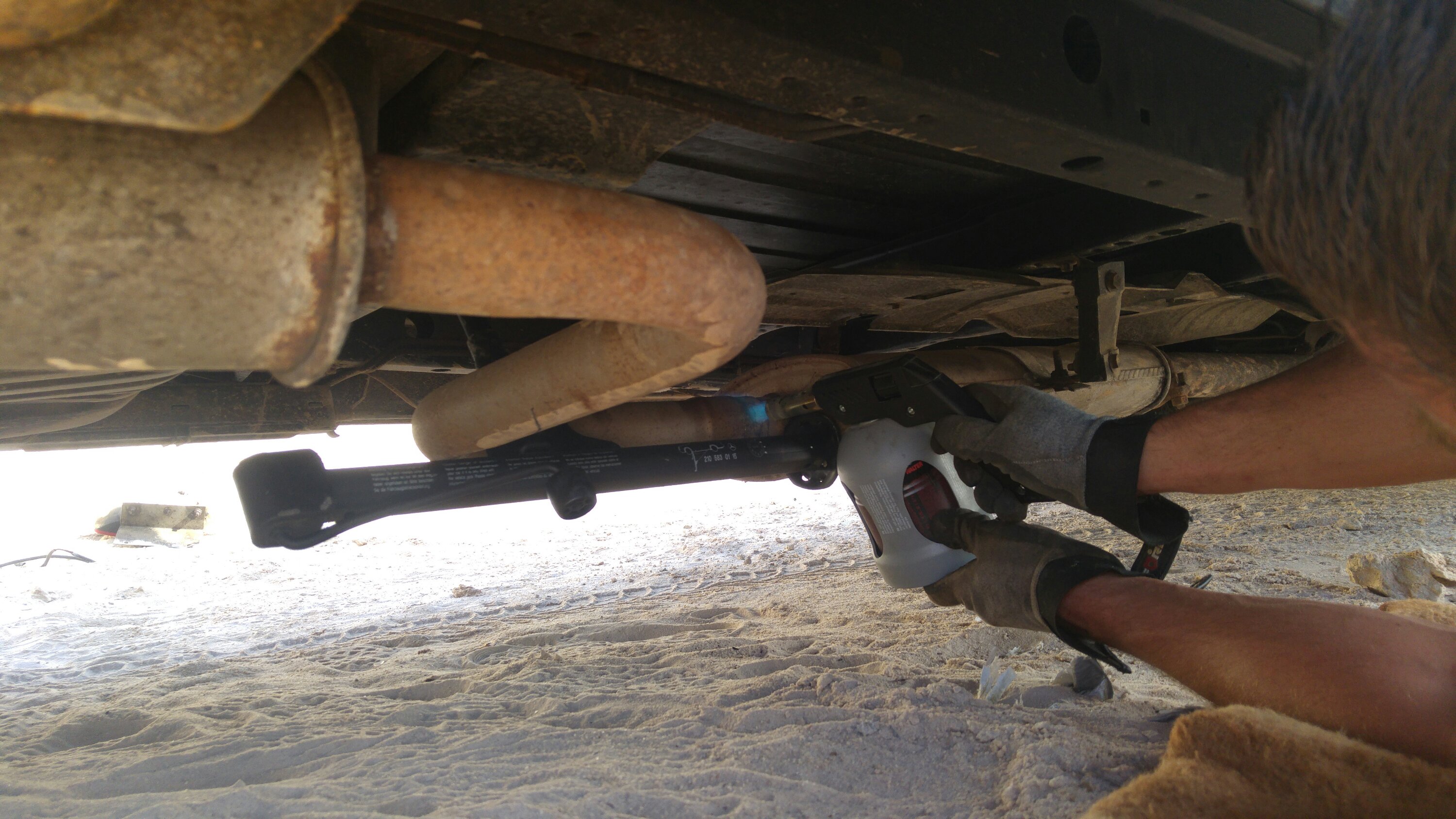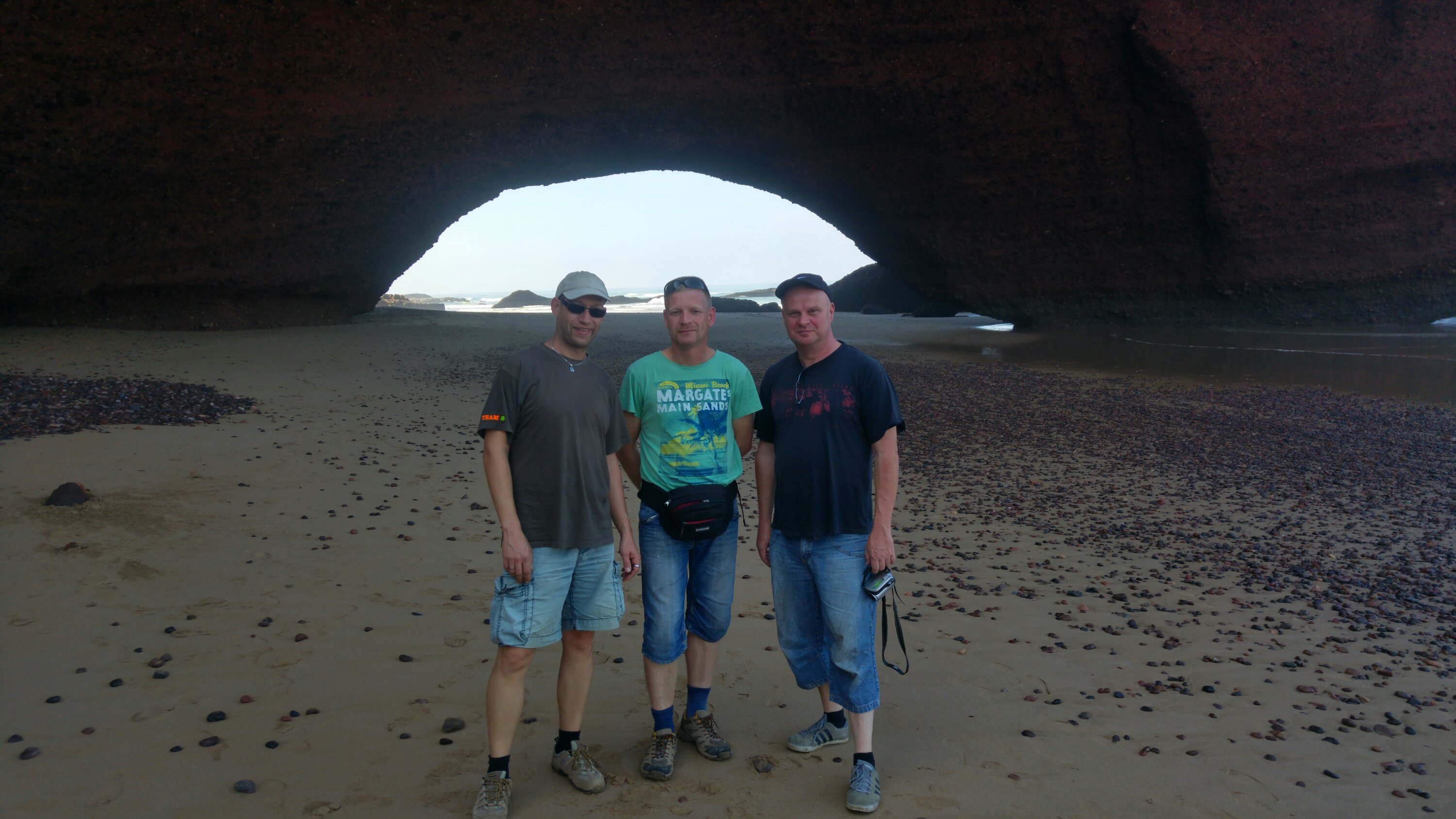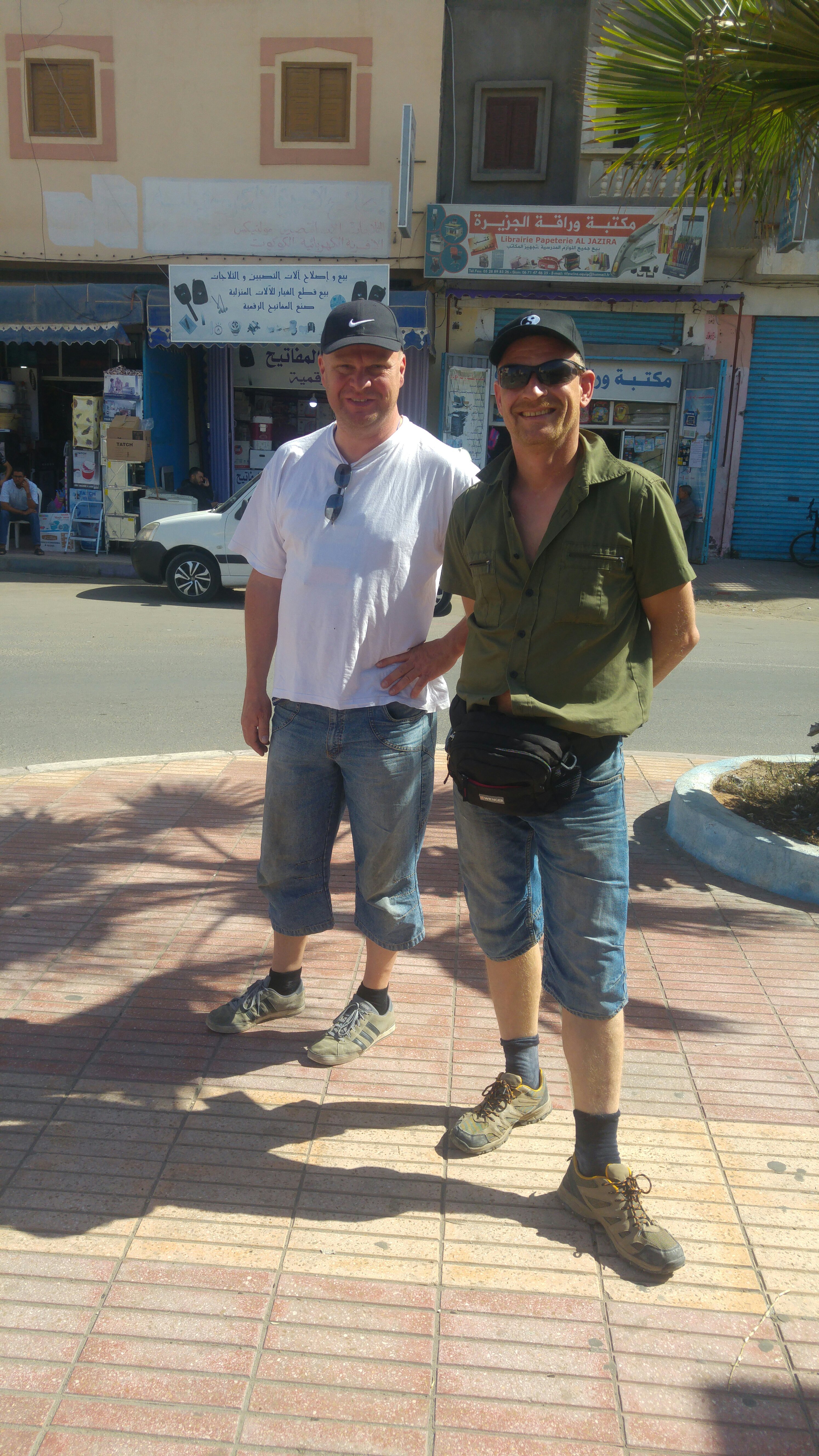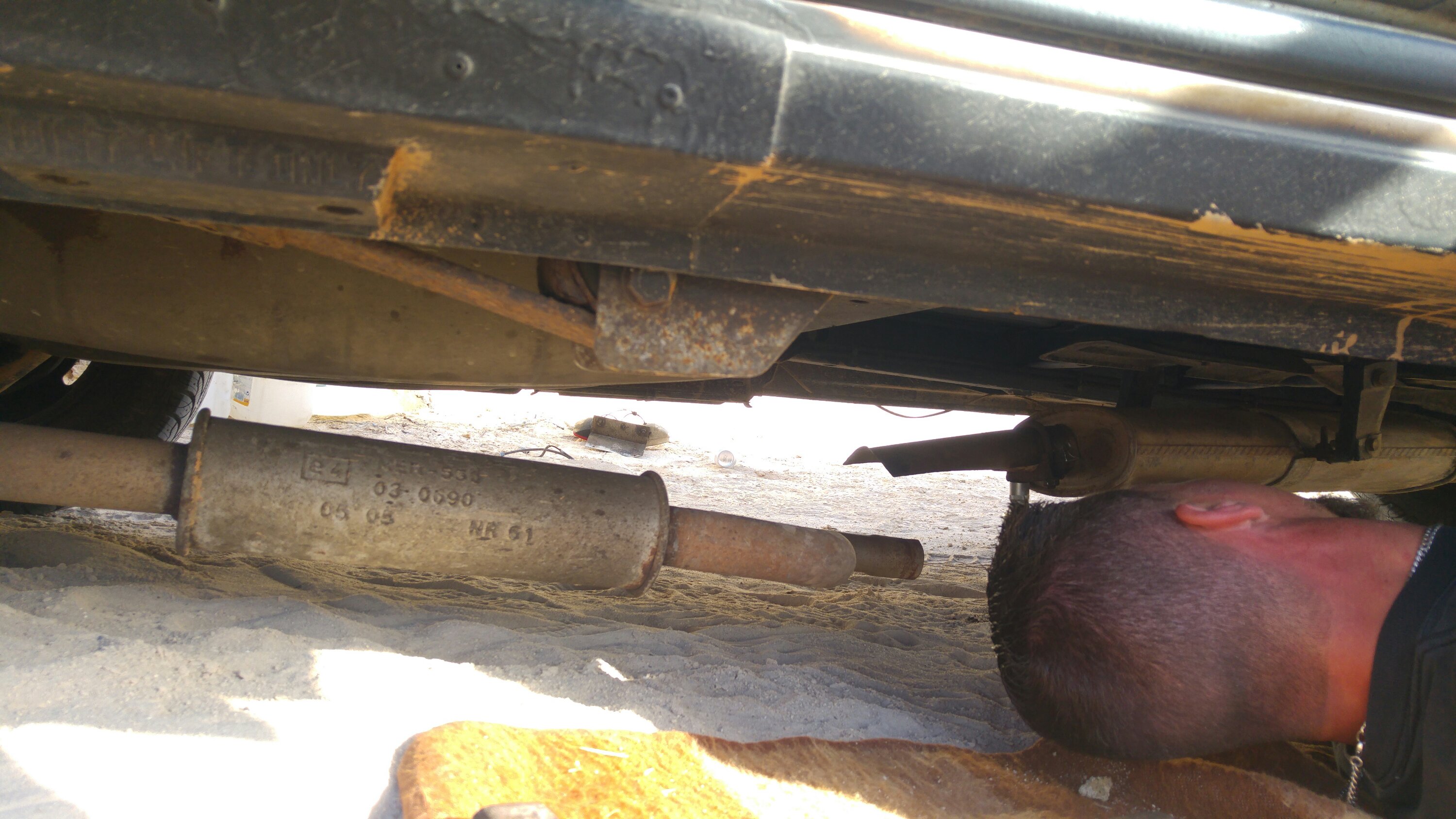 Gegen 10 Uhr ging es nach kurzem Briefing der Orgs zunächst auf die Straße, nach ca. 150 km bogen wir dann rechts in die Wüste ab. Endlich Offroad. Erstmal Mittagspause und dann gings los. Unendliche Weite und viel Sand. Das Führungsfahrzeug mit dem Wüstenguide vorne weg, die anderen hinterher. Kilometer um Kilometer im zügigen Tempo. Dann die ersten Einsandungen, gleich zwei der Kleinlaster (Pritschen) hatte es erwischt. Schieben, Ziehen und nach einer Weile hatte der Sand sie wieder frei gegeben und es konnte weiter gehen. Gegen Nachmittag erreichten wir eine Engstelle an der die Rallyeboliden einzeln durch mussten. Leider waren die Abstände zwischen den Fahrzeugen zu gering, sodass es zu weiteren Einsandungen kam. Erschwerend hinzu kam der felsige Untergrund mit vielen, teils größeren, Steinen. Als sich alle durch diese Passage gemogelt hatten, gab es eine erste Bestandsaufnahme… Ein Tank gerissen, ein Schlauch von der Servopumpe gerissen, eine Benzinleitung abgerissen und ein Kühler aufgerissen. Bei unseren drei Boliden alles bestens! Das bedeutete Nachtlager aufschlagen und die defekten Wagen reparieren. Die Servopumpe war schnell repariert. Aus dem Tank musste erstmal der Sprit abgelassen werden bevor er geklebt werden konnte. Da wir gut ausgestattet sind und Alex eine Benzinpumpe dabei hat, war der Sprit schnell raus. Dann konnte er mit Franks Zauberkleber geklebt werden. Am nächsten morgen war er wieder dicht. Unsere Werkstattausrüstung wurde schon bis hierher mehrfach benötigt und wurde auch von den Orgs immer mal wieder benutzt. Bei den anderen beiden Autos dauerte es etwas länger. Nach dem Abendbrot gab es noch ein, zwei Bierchen bevor es zur Nachtruhe ging.