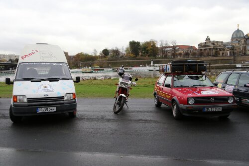 Zur Verabschiedung der Rallye am Königsufer in Dresden sind immerhin 21 von 38 Teams gekommen. Vor der Kulisse unserer zauberhaften Stadt gibts schöne Fotos, Familie und Freunde sind gekommen, die eine oder andere Abschiedsträne fließt. Nun gehts endlich los! Abends in der Brandbaude zu Hohnstein gibts ein sehr leckeres Buffet, viel zu erzählen, ein Feuer knistert in der Nacht. Es wird spät.