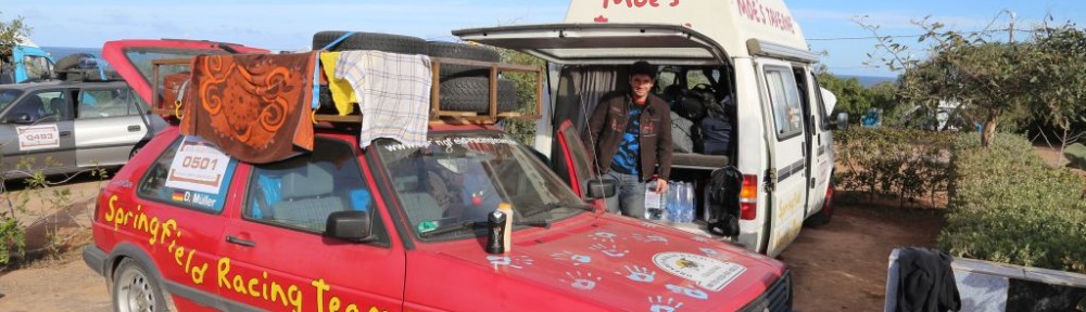 Die Straße führt durch steinige Landschaften, Einöden und Wüste. kilometerweit nichts, nur Steine, Sand, Wind und Sonne. Obwohl die Sonne scheint und wir in den Autos schwitzen, musste Adi sich lange Unterhosen und zwei Jacken anziehen, Weichei… Nein, nein, der Wind weht ziemlich stark mit viel Sand und ist kalt. Ab und zu sieht man Menschen, die irgendwo am Straßenrand stehen und warten. Ab und zu sieht man auch eine Schafherde oder freilaufende Kamele (nicht nur neben der Straße auch auf der Straße!). Ach ja, noch was komisches, es hat geregnet!!! Eine Wolke über uns und aus der regnet es. Nach 500 km erreichen wir kurz vor Laayoune das Beduinen-Camp (Campingplatz). Dieser Campingplatz liegt ca. 5 km von der eigentlichen Straße entfernt, mitten im Nichts. Dort hat sich ein Belgier mit seiner Frau niedergelassen und ein paar Beduinenzelte aufgestellt und ein kleines Restaurant eröffnet. Dort treffen wir auch die anderen Rallyeteilnehmer wieder. Zum Abendbrot gibts das „Menu of the desert“. Courgette-Suppe (keine Ahnung was das war, aber es hat geschmeckt), Kamelfleisch-Spieße mit Gemüse und Reis und zum Schluss einen leckeren Obstsalat.