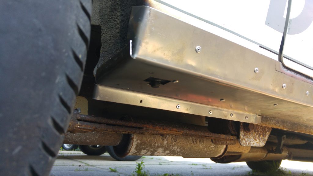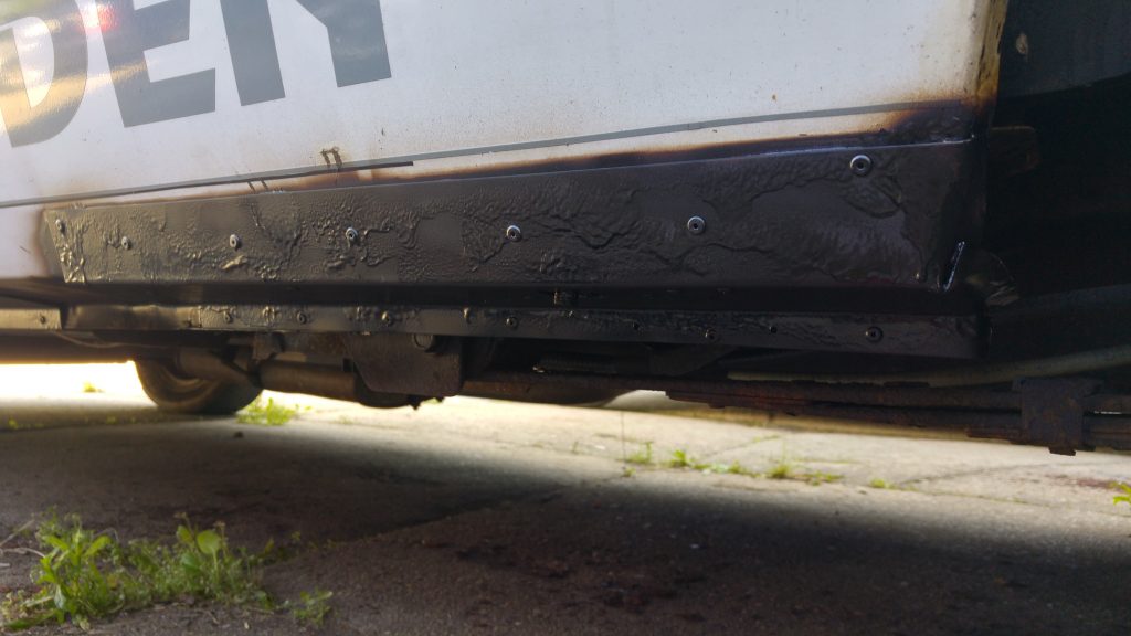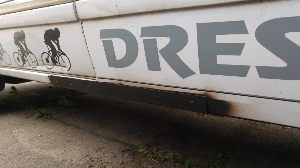 Dann ging es dem Rost in den Schwellern an den Kragen. Da Einschweißen, Spachteln und Lackieren viel zu viel Zeit kostet, wurde sich für die Low-Budget-Variante, dem Aufnieten von Blechen, entschieden. Das Ergebnis kann sich sehen lassen, denke ich.