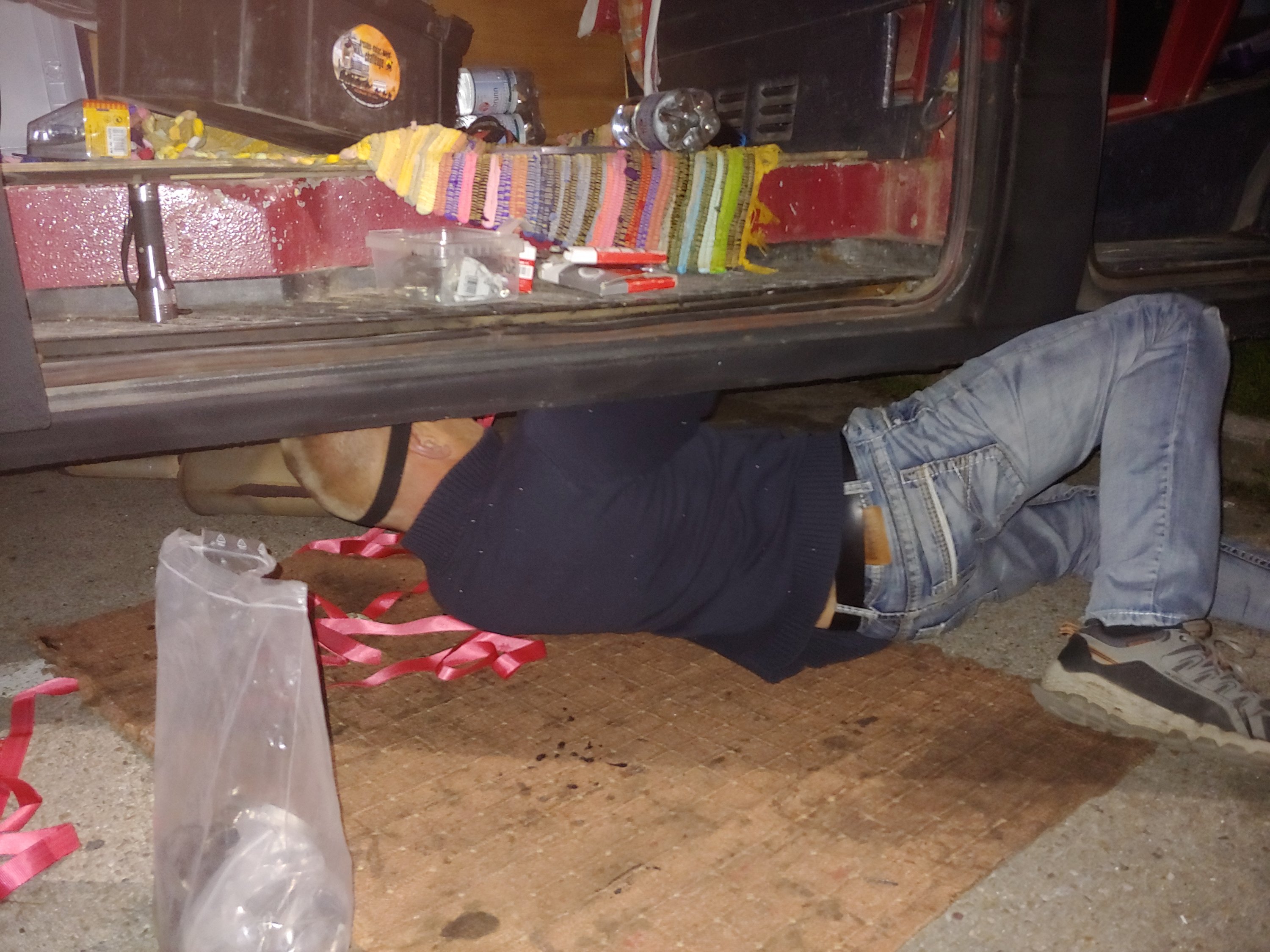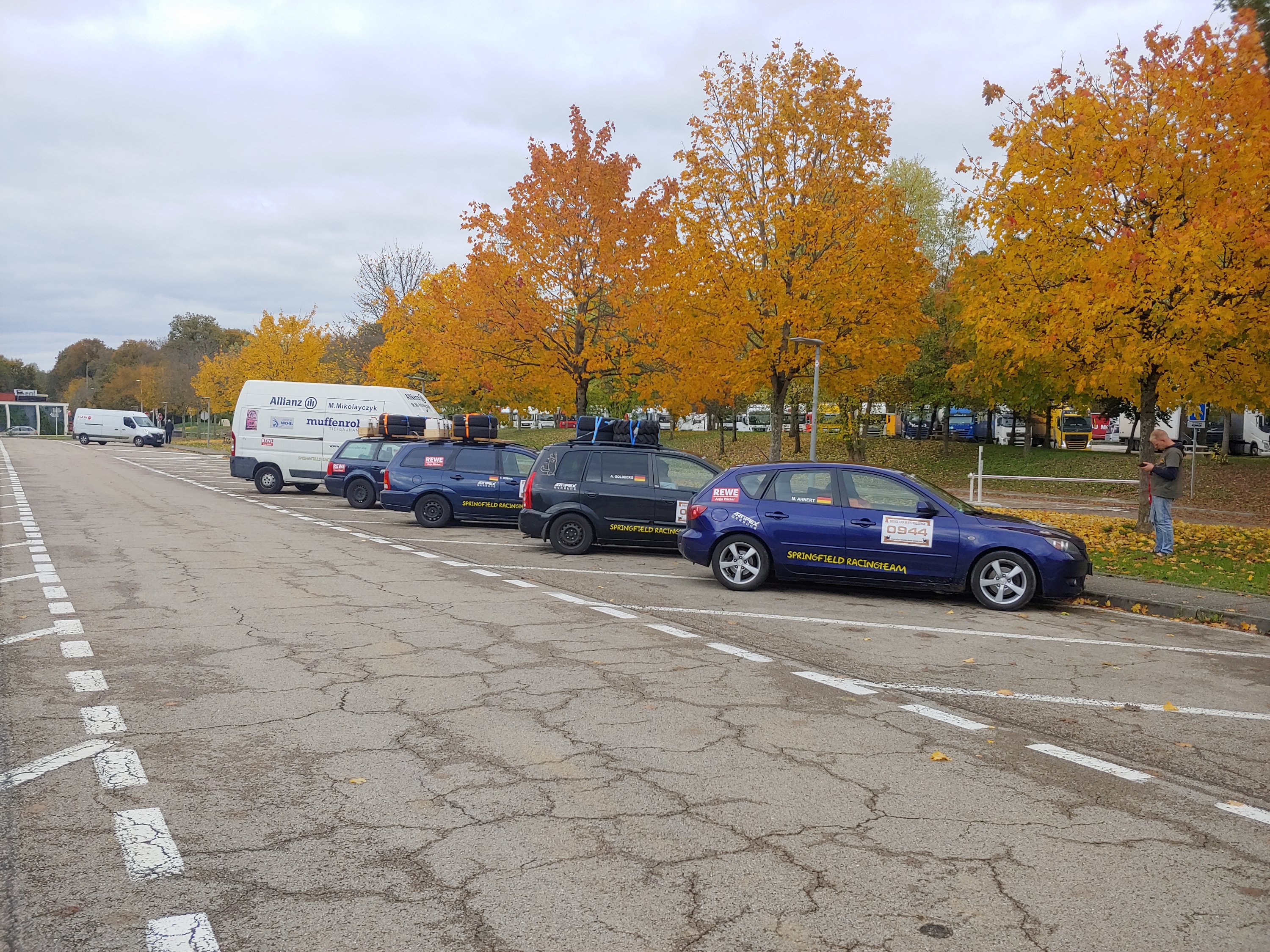 Nachdem wir am gestrigen Abend Bier getrunken und beim Winzer geschlafen haben, konnte es nach einem ausgiebigen Frühstück los gehen. Ziel für uns (außer Robert, dazu später mehr) heute: Nîmes. Die Strecke führte heute direkt nach Frankreich, vorbei an Straßburg und Mulhouse nach Nîmes. Die Auto spulten zuverlässig die ca. 850 km runter und so trafen wir am Abend auf dem F1-Hotel-Parkplatz, nach Roadbook, ein. Nach einem nicht so schönen Abendessen im Grill-Restaurant in der Nähe gab es noch ein Bierchen… Bis Falk, einer von den Rallye-Orgs, um die Ecke kam. Er hatte den Auspuff von seinem Sprinter verloren. Da wir gut ausgerüstet sind und improvisieren können, konnte mit einem Stückchen Rohr, etwas Draht, Spanngurt und Auspuffbandage geholfen werden. Ob es hält erfahren wir in San Roque…