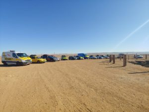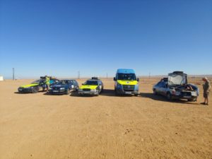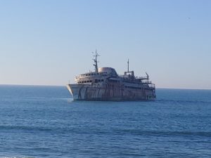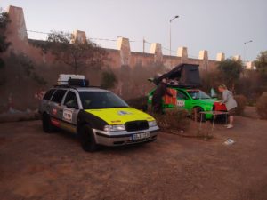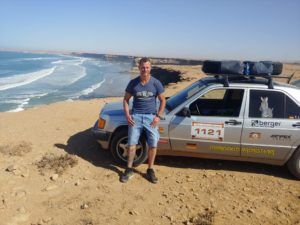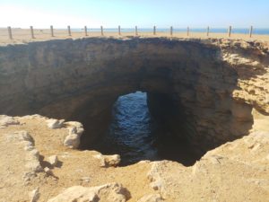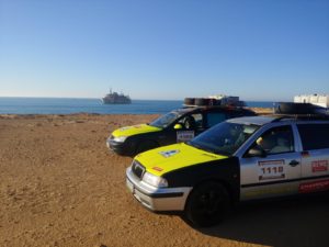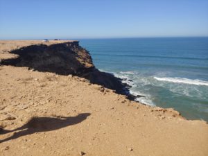 Unterwegs gab es das eine oder andere Highlight zu besichtigen. Mittagspause haben wir direkt an der Steilküste gemacht, eine sehr schöne Aussicht! Danach rollten wir zur Grotte d’Ajabullah. Ein ca. 30 m Loch im Boden der Steilküste. Nächstes Highlight lag sozusagen vor Tarfaya, ein Schiffswrack, das 2008 vor der Küste Marokkos auf Grund lief und seit dem der Erosion ausgesetzt ist. Damit war die erst Ende 2007 neu eingerichtete Fährverbindung zwischen Fuerteventura und Tarfaya wieder Geschichte.