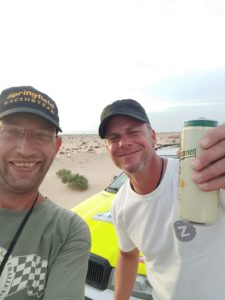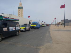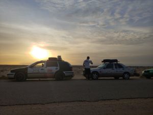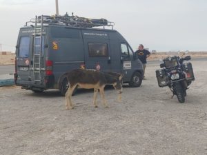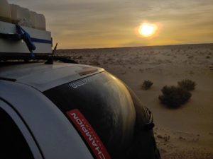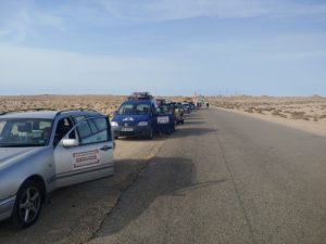 Gegen 11:30 Uhr ging es dann zur marokkanischen Grenze. Ca. 100 km im Konvoi mussten bewältigt werden. Dann hieß es Geduld haben, denn wir waren in die Mittagspause der Grenzer geraten. Ab 15 Uhr ging es dann pünktlich weiter… Stück für Stück wurde jedes Fahrzeug einzeln in den Abfertigungsbereich gelassen. Mindestens drei Stationen mussten bewältigt werden, Transporter mussten zusätzlich in den Scanner. Nach ca. 1,5 h war man dann endlich im Niemandsland. Dann zur mauretanischen Grenze, erst auf Asphalt dann Offroad durch die Wüste. Angekommen im mauretanischen Abfertigungsbereich musste erstmal das Visum gemacht werden, danach folgte die Zollkontrolle und im Anschluss die Polizeikontrolle mit der Fahrzeugregistrierung. Erstaunlicherweise ging die mauretanische Einreise besser als die marokkanische Ausreise. Gegen 18.15 Uhr befanden sich die ersten Teams auf mauretanischen Boden. Weitere ca. 2 Stunden später waren alle da und wir konnten zu unserem ersten Nachtlager in Mauretanien fahren. Ein Stück Offroad mit weichem Sand führte uns zu unserem Nachtlager. Auch die ersten Einsandungen gehörten dazu.
